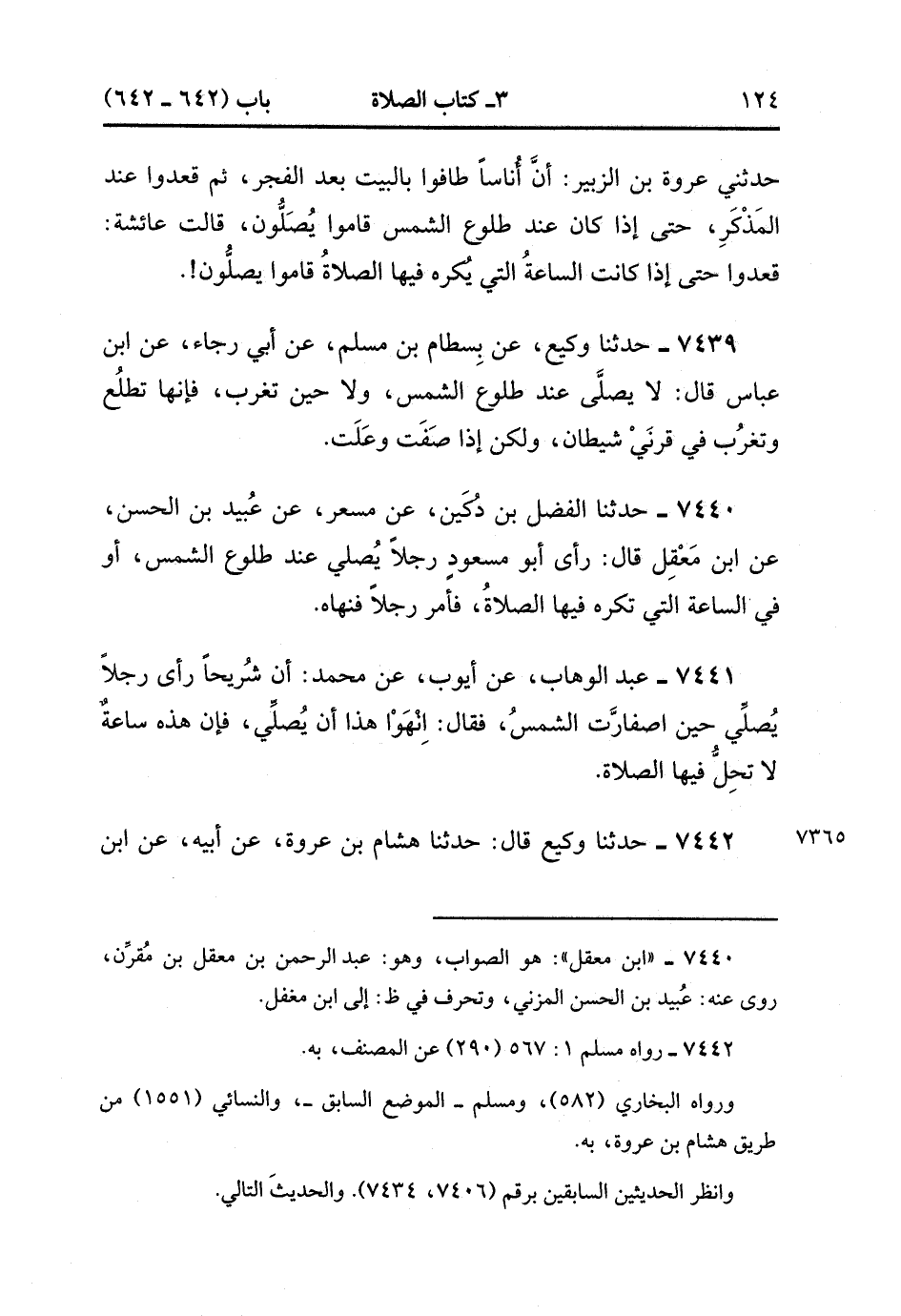 7442- حَدَّثَنَا وَكِيعٌ , قَالَ : حدَّثَنَا هِشَامُ بْنُ عُرْوَةَ ، عَنْ أَبِيهِ ، عَنِ ابْنِ عُمَرَ ، قَالَ : قَالَ رَسُولُ اللهِ صَلَّى الله عَلَيْهِ وَسَلَّمَ : لاَ تَحَرَّوْا بِصَلاَتِكُمْ طُلُوعَ الشَّمْسِ ، وَلاَ غُرُوبَهَا فَإِنَّهَا تَطْلُعُ بِقَرْنِ الشَّيْطَانِ. (2/354).