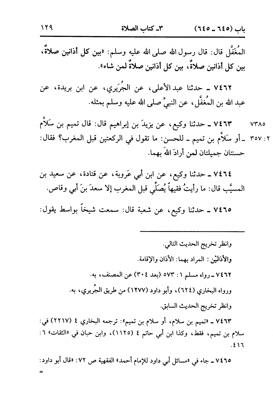 7464- حَدَّثَنَا وَكِيعٌ ، عَنِ ابْنِ أَبِي عَرُوبَةَ ، عَنْ قَتَادَةَ ، عَنْ سَعِيدِ بْنِ الْمُسَيَّبِ ، قَالَ : مَا رَأَيْت فَقِيهًا يُصَلِّي قَبْلَ الْمَغْرِبِ إِلاَّ سَعْدَ بْنَ أَبِي وَقَّاصٍ.