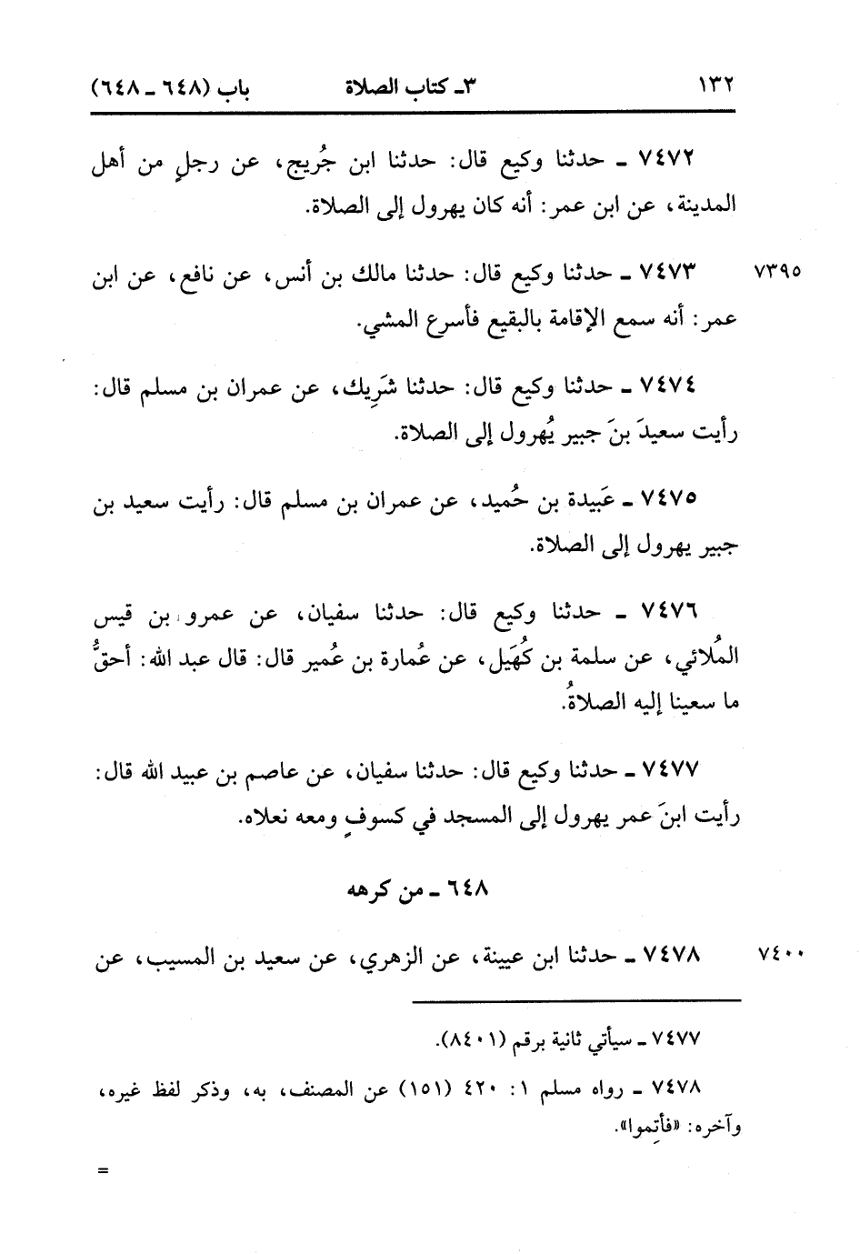 7474- حَدَّثَنَا وَكِيعٌ , قَالَ : حدَّثَنَا شَرِيكٌ ، عَنْ عِمْرَانَ بْنِ مُسْلِمٍ ، قَالَ : رَأَيْتُ سَعِيدَ بْنَ جُبَيْرٍ يُهَرْوِلُ إلَى الصَّلاَة.