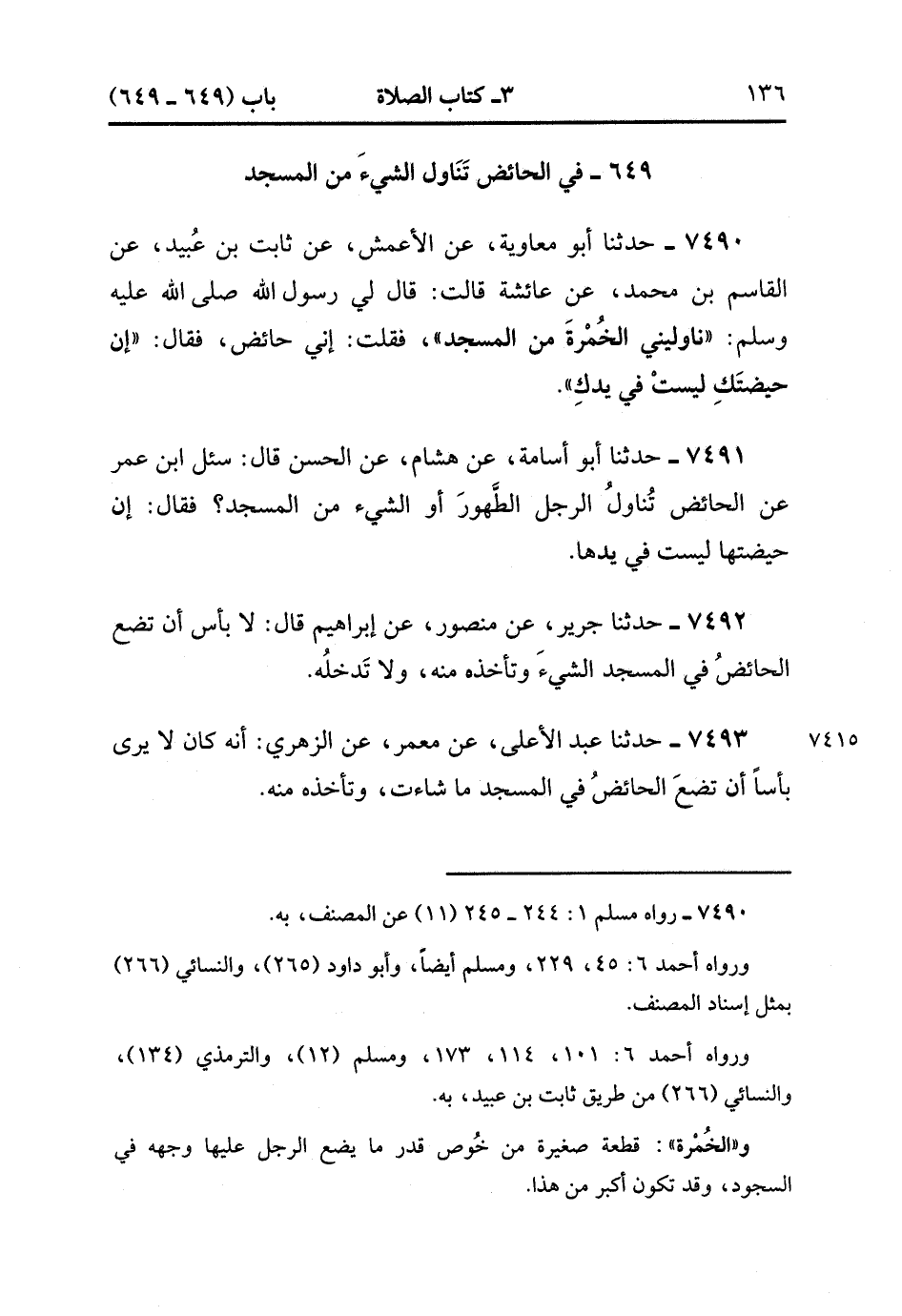 7490- حَدَّثَنَا أَبُو مُعَاوِيَةَ ، عَنِ الأَعْمَشِ ، عَنْ ثَابِتِ بْنِ عُبَيْدٍ ، عَنِ الْقَاسِمِ بْنِ مُحَمَّدٍ ، عَنْ عَائِشَةَ ، قَالَتْ : قَالَ لِي رَسُولُ اللهِ صَلَّى الله عَلَيْهِ وَسَلَّمَ : نَاوِلِينِي الْخُمْرَةَ مِنَ الْمَسْجِدِ فَقُلْتُ : إنِّي حَائِضٌ ، فَقَالَ إنَّ حَيْضَتَكَ لَيْسَتْ فِي يَدِك.