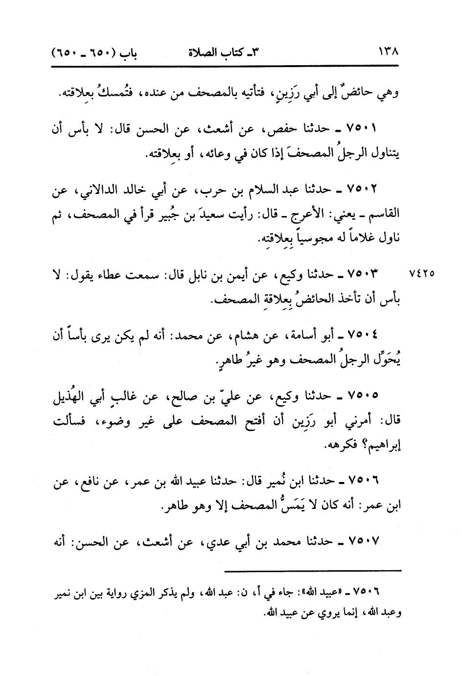 7506- حَدَّثَنَا ابْنُ نُمَيْرٍ , قَالَ : حدَّثَنَا عُبَيْدُ اللهِ بْنُ عُمَرَ ، عَنْ نَافِعٍ ، عَنِ ابْنِ عُمَرَ ، أَنَّهُ كَانَ لاَ يَمَسُّ الْمُصْحَفَ إِلاَّ وَهُوَ طَاهِرٌ.