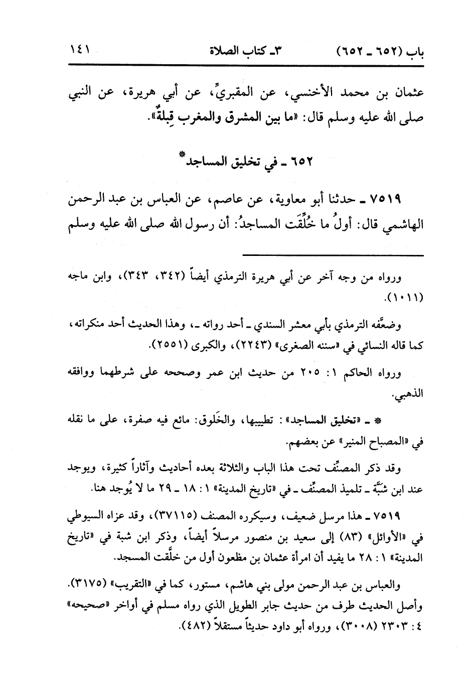 7519- حَدَّثَنَا أَبُو مُعَاوِيَةَ ، عَنْ عَاصِمٍ ، عَنِ الْعَبَّاسِ بنْ عَبْدِ الرَّحْمَنِ الْهَاشِمِيِّ ، قَالَ : أَوَّلُ مَا خُلِّقَتِ الْمَسَاجِدُ ، أَنَّ رَسُولَ اللهِ صَلَّى الله عَلَيْهِ وَسَلَّمَ رَأَى فِي الْمَسْجِدِ نُخَامَةً فَحَكَّهَا ، ثُمَّ أَمَرَ بِخَلُوقٍ فَلُطِخَ مَكَانَهَا. قَالَ : فَخَلَّقَ النَّاسُ الْمَسَاجِدَ. (2/362).
