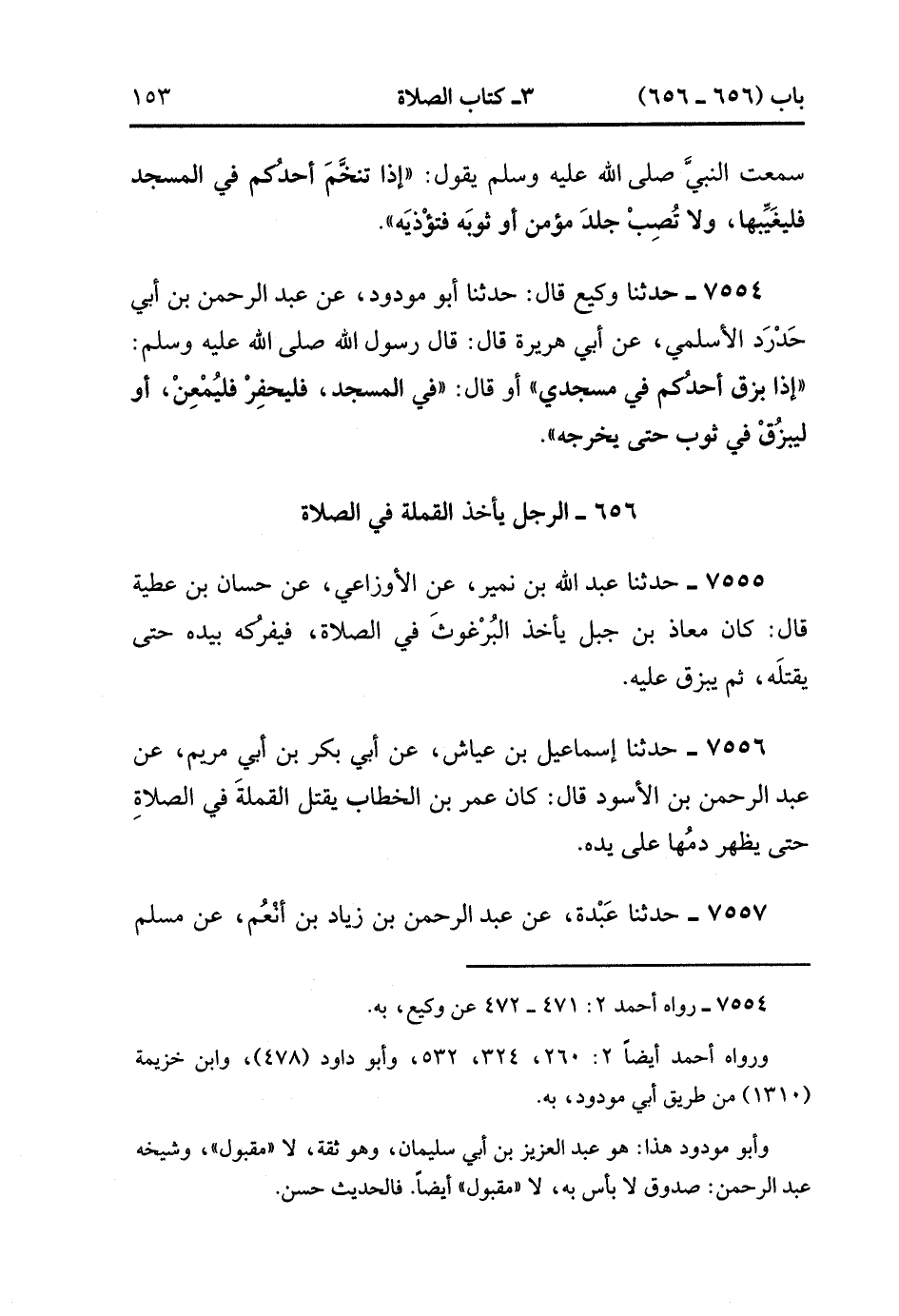 7555- حَدَّثَنَا عَبْدُ اللهِ بْنُ نُمَيْرٍ ، عَنِ الأَوْزَاعِيِّ ، عَنْ حَسَّانَ بْنِ عَطِيَّةَ ، قَالَ : كَانَ مُعَاذُ بْنُ جَبَلٍ يَأْخُذُ الْبُرْغُوثَ فِي الصَّلاَة فَيَفْرُكُهُ بِيَدِهِ حَتَّى يَقْتُلَهُ ، ثُمَّ يَبْزُقُ عَلَيْهِ.