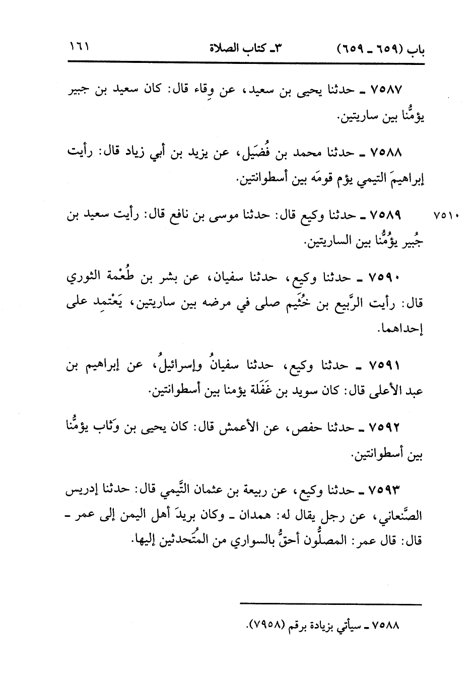 7587- حَدَّثَنَا يَحْيَى بْنُ سَعِيدٍ ، عَنْ وِقَاءٍ ، قَالَ : كَانَ سَعِيدُ بْنُ جُبَيْرٍ يَؤُمُّنَا بَيْنَ سَارِيَتَيْنِ.