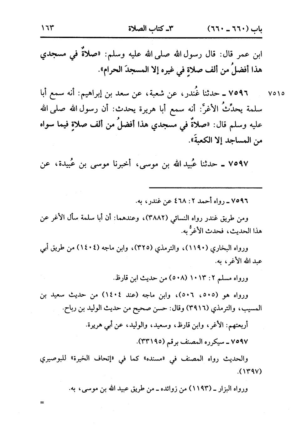 7596- حَدَّثَنَا غُنْدَرٌ ، عَنْ شُعْبَةَ ، عَنْ سَعْدِ بْنِ إبْرَاهِيمَ ، أَنَّهُ سَمِعَ أَبَا سَلَمَةَ يُحَدِّثُ الأَغَرَّ ، أَنَّهُ سَمِعَ أَبَا هُرَيْرَةَ يُحَدِّثُ ، أَنَّ رَسُولَ اللهِ صَلَّى الله عَلَيْهِ وَسَلَّمَ قَالَ : صَلاَةٌ فِي مَسْجِدِي هَذَا أَفْضَلُ مِنْ أَلْفِ صَلاَةٍ فِيمَا سِوَاهُ مِنَ الْمَسَاجِدِ إِلاَّ الْكَعْبَةَ. (2/371).