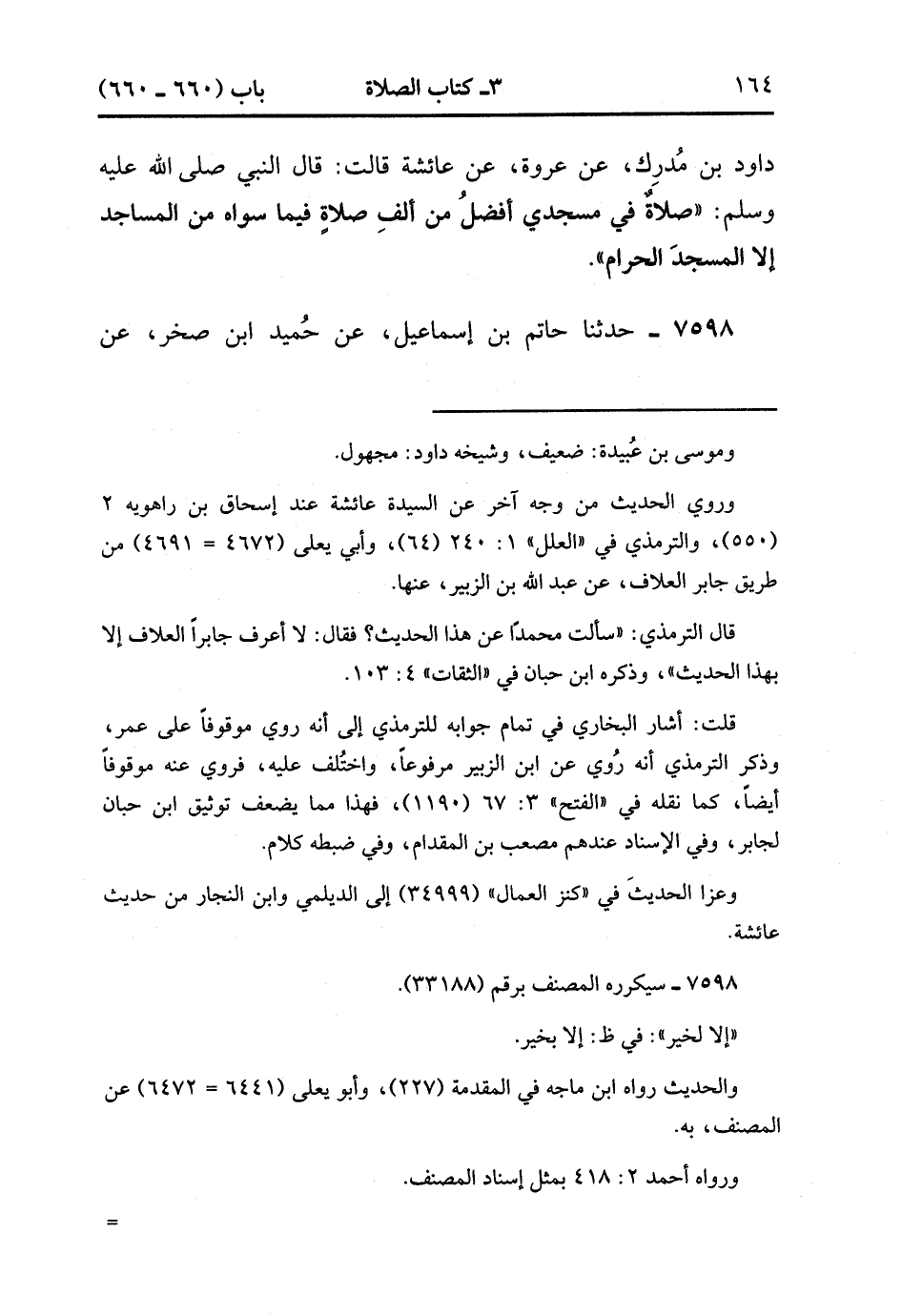 7597- حَدَّثَنَا عُبَيْدُ اللهِ بْنُ مُوسَى أَخْبَرَنَا مُوسَى بْنُ عُبَيْدَةَ ، عَنْ دَاوُدَ بْنِ مُدْرِكٍ ، عَنْ عُرْوَةَ ، عَنْ عَائِشَةَ ، قالَتْ : قَالَ النَّبِيُّ صَلَّى الله عَلَيْهِ وَسَلَّمَ : صَلاَةٌ فِي مَسْجِدِي أَفْضَلُ مِنْ أَلْفِ صَلاَةٍ فِيمَا سِوَاهُ مِنَ الْمَسَاجِدِ إِلاَّ الْمَسْجِدَ الْحَرَامَ. (2/371).