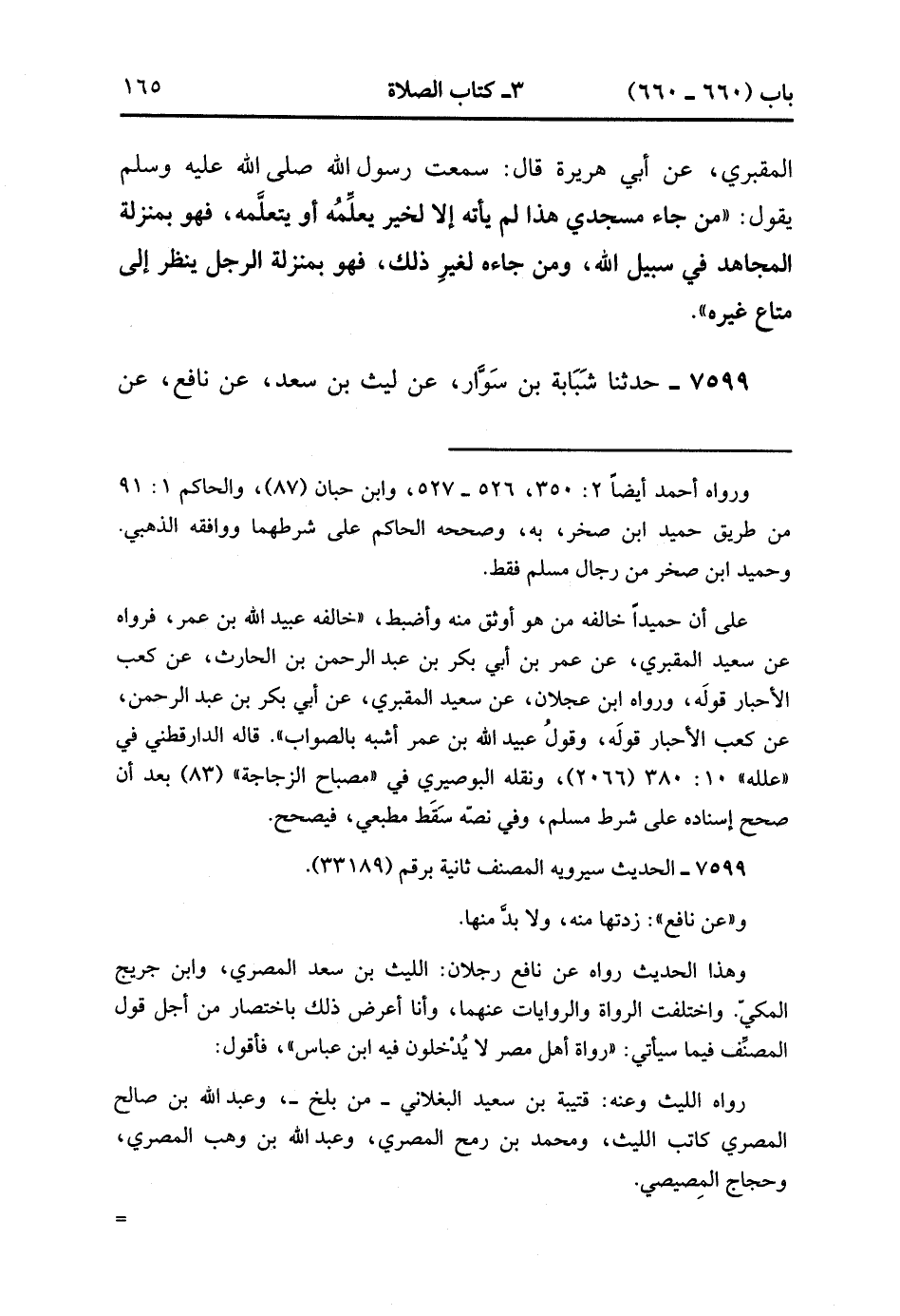 7598- حَدَّثَنَا حَاتِمُ بْنُ إسْمَاعِيلَ ، عَنْ حُمَيْدِ بْنِ صَخْرٍ ، عَنِ الْمَقْبُرِيِّ ، عَنْ أَبِي هُرَيْرَةَ ، قَالَ : سَمِعْتُ رَسُولَ اللهِ صَلَّى الله عَلَيْهِ وَسَلَّمَ يَقُولُ : مَنْ جَاءَ مَسْجِدِي هَذَا لَمْ يَأْتِهِ إِلاَّ لِخَيْرٍ يُعَلِّمُهُ ، أَوْ يَتَعَلَّمُهُ فَهُوَ بِمَنْزِلَةِ الْمُجَاهِدِ فِي سَبِيلِ اللهِ وَمَنْ جَاءَهُ لِغَيْرِ ذَلِكَ فَهُوَ بِمَنْزِلَةِ الرَّجُلِ يَنْظُرُ إلَى مَتَاعِ غَيْرِهِ. (2/371).