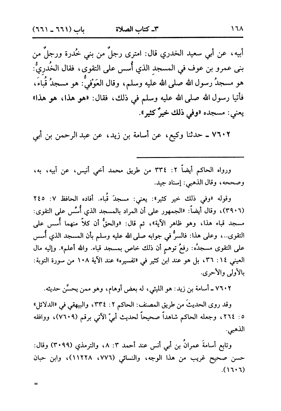 7602- حَدَّثَنَا وَكِيعٌ ، عَنْ أُسَامَةَ بْنِ زَيْدٍ ، عَنْ عَبْدِ الرَّحْمَنِ بْنِ أَبِي سَعِيدٍ الْخُدْرِيِّ ، عَنْ أَبِيهِ ، قَالَ : الْمَسْجِدُ الَّذِي أُسِّسَ عَلَى التَّقْوَى هُوَ مَسْجِدُ النَّبِيِّ صَلَّى الله عَلَيْهِ وَسَلَّمَ. (2/372).