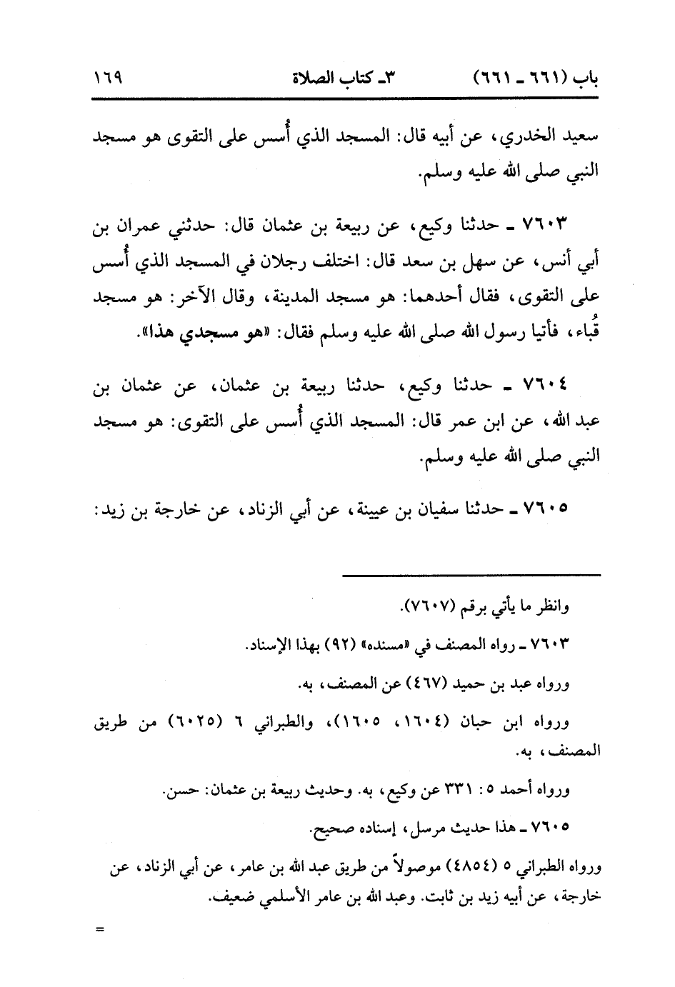 7605- حَدَّثَنَا سُفْيَانُ بْنُ عُيَيْنَةَ ، عَنْ أَبِي الزِّنَادِ ، عَنْ خَارِجَةَ بْنِ زَيْدٍ ، أَنَّ النَّبِيَّ صَلَّى الله عَلَيْهِ وَسَلَّمَ ، قَالَ : الْمَسْجِدُ الَّذِي أُسِّسَ عَلَى التَّقْوَى مِنْ أَوَّلِ يَوْمٍ مَسْجِدُ النَّبِيِّ صَلَّى الله عَلَيْهِ وَسَلَّمَ. (2/372).