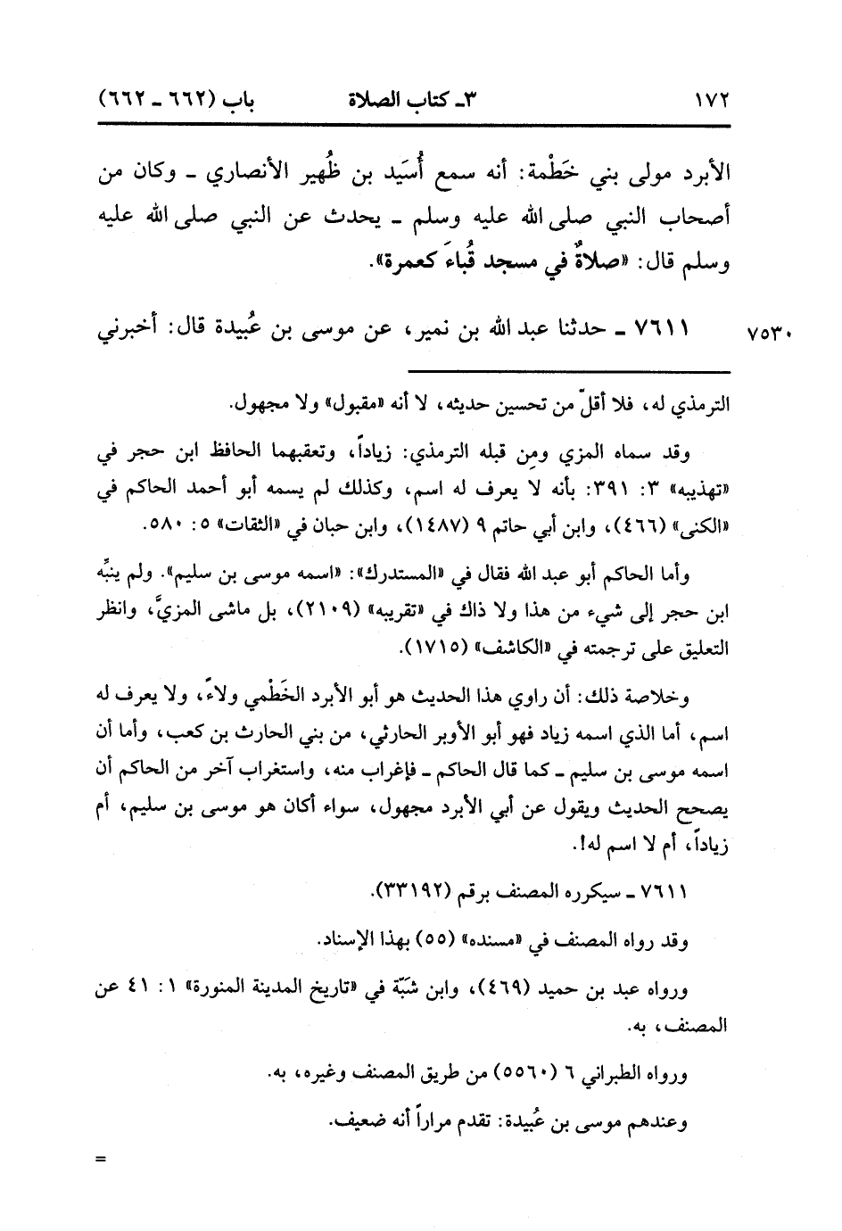 7611- حَدَّثَنَا عَبْدُ اللهِ بْنُ نُمَيْرٍ ، عَنْ مُوسَى بْنِ عُبَيْدَةَ ، قَالَ : أَخْبَرَنِي يُوسُفُ بْنُ طَهْمَانَ ، عَنْ أَبِي أُمَامَةَ بْنِ سَهْلٍ ، عَنْ أَبِيهِ سَهْلِ بْنِ حُنَيْفٍ ، قَالَ : قَالَ رَسُولُ اللهِ صَلَّى الله عَلَيْهِ وَسَلَّمَ : مَنْ تَوَضَّأَ فَأَحْسَنَ وُضُوءَهُ ، ثُمَّ جَاءَ مَسْجِدَ قُبَاءٍ فَرَكَعَ فِيهِ أَرْبَعَ رَكَعَاتٍ كَانَ ذَلِكَ عَدْلَ عُمْرَةٍ. (2/373).
