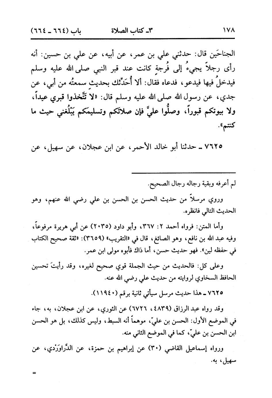 7625- حَدَّثَنَا أَبُو خَالِدٍ الأَحْمَرِِ ، عَنِ ابْنِ عَجْلاَنَ ، عَنْ سُهَيْلِ ، عَنْ حَسَنِ بْنِ حَسَنٍ ، قَالَ : قَالَ رَسُولُ اللهِ صَلَّى الله عَلَيْهِ وَسَلَّمَ : لاَ تَتَّخِذُوا قَبْرِي عِيدًا ، وَلاَ بُيُوتَكُمْ قُبُورًا وَصَلُّوا عَلَيَّ حَيْثُمَا كُنْتُمْ ، فَإِنَّ صَلاَتَكُمْ تَبْلُغُنِي. (2/375).