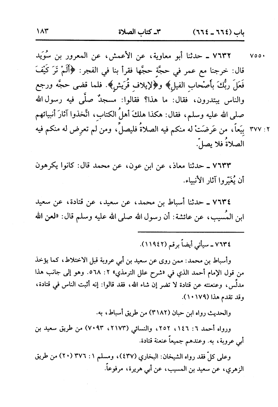 7632- حَدَّثَنَا أَبُو مُعَاوِيَةَ ، عَنِ الأَعْمَشِ ، عَنِ الْمَعْرُورِ بْنِ سُوَيْدٍ ، قَالَ : خَرَجْنَا مَعَ عُمَرَ فِي حَجَّةٍ حَجَّهَا فَقَرَأَ بِنَا فِي الْفَجْرِ : {أَلَمْ تَرَ كَيْفَ فَعَلَ رَبُّكَ بِأَصْحَابِ الْفِيلِ} ، وَ{لإِيلاَفِ قُرَيْشٍ} فَلَمَّا قَضَى حَجَّهُ وَرَجَعَ وَالنَّاسُ يَبْتَدِرُونَ ، فَقَالَ : مَا هَذَا ؟ فَقَالُوا : مَسْجِدٌ صَلَّى فِيهِ رَسُولُ اللهِ صَلَّى الله عَلَيْهِ وَسَلَّمَ ، فَقَالَ : هَكَذَا هَلَكَ أَهْلُ الْكِتَابِ اتَّخَذُوا آثَارَ أَنْبِيَائِهِمْ بِيَعًا مَنْ عَرَضَتْ لَهُ مِنْكُمْ فِيهِ الصَّلاَة فَلْيُصَلِّ وَمَنْ لَمْ تَعْرِضْ لَهُ مِنْكُمْ فِيهِ الصَّلاَة فَلاَ يُصَلِّ. (2/376)