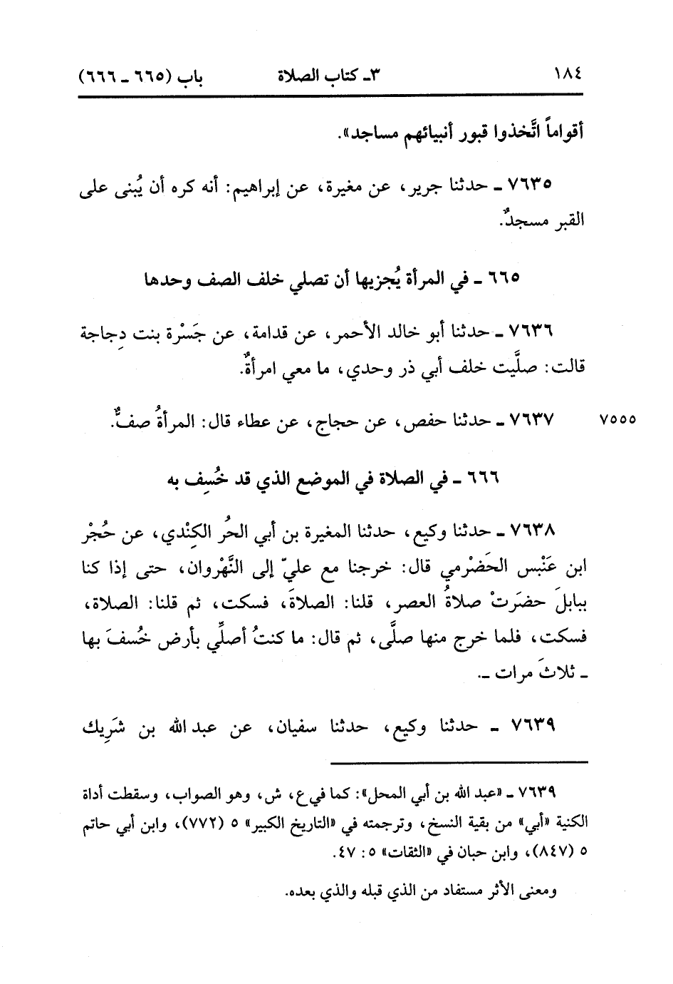7638- حَدَّثَنَا وَكِيعٌ حَدَّثَنَا الْمُغِيرَةُ بْنُ أَبِي الْحُرِّ الْكِنْدِيِّ ، عَنْ حُجْرِ بْنِ ، عَنْبَسٍ الْحَضْرَمِيِّ ، قَالَ : خَرَجْنَا مَعَ عَلِيٍّ إلَى النَّهْرَوَانِ حَتَّى إذَا كُنَّا بِبَابِلَ حَضَرَتْ صَلاَةُ الْعَصْرِ قُلْنَا : الصَّلاَة فَسَكَتَ ، ثُمَّ قُلْنَا الصَّلاَة فَسَكَتَ ، فَلَمَّا خَرَجَ مِنْهَا صَلَّى ، ثُمَّ قَالَ : مَا كُنْتُ أُصَلِّي بِأَرْضٍ خُسِفَ بِهَا ثَلاَثَ مَرَّاتٍ.