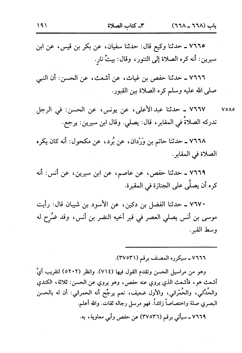7666- حَدَّثَنَا حَفْصُ بْنُ غِيَاثٍ ، عَنْ أَشْعَثَ ، عَنِ الْحَسَنِ ، أَنَّ النَّبِيَّ صَلَّى الله عَلَيْهِ وَسَلَّمَ كَرِهَ الصَّلاَة بَيْنَ الْقُبُورِ.