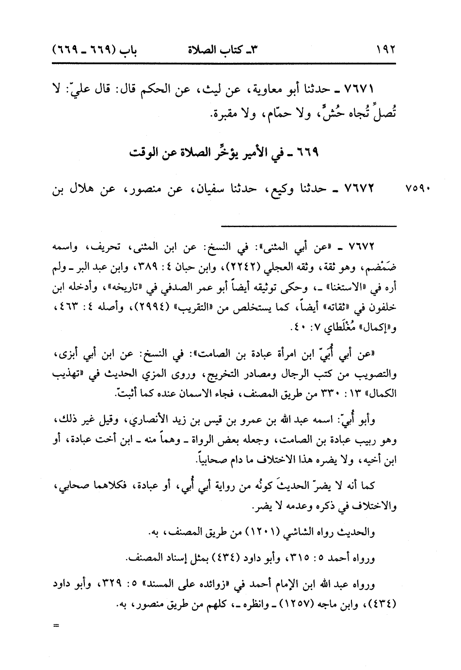 7672- حَدَّثَنَا وَكِيعٌ ، حَدَّثَنَا سُفْيَانُ ، عَنْ مَنْصُورٍ ، عَنْ هِلاَلِ بْنِ يَِسَافٍ ، عَنِ أبي الْمُثَنَّى الْحِمْصِيِّ ، عَنِ أَبِي أَُبَِي ابن امرَأَة عُبَادَةَ بْنِ الصَّامِتِ ،عَنْ عُبَادَةَ بْنِ الصَّامِتِ قَالَ : قَالَ رَسُولُ اللهِ صَلَّى الله عَلَيْهِ وَسَلَّمَ : أَنَّهَا سَتَكُونُ عَلَيْكُمْ أُمَرَاءُ فَتَشْغَلُهُمْ أَشْيَاءٌ عَنِ الصَّلاَة حَتَّى يُؤَخِّرُوهَا عَنْ وَقْتِهَا فَصَلُّوهَا لِوَقْتِهَا ، فَقَالَ رَجُلٌ : يَا رَسُولَ اللهِ إِنْ أَدْرَكْتُهَا مَعَهُمْ أُصَلِي مَعَهُمْ ؟ قَالَ : نَعَمْ إِنْ شِئْتَ. (2/380).