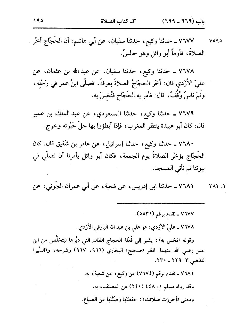 7680- حَدَّثَنَا وَكِيعٌ ، حَدَّثَنَا إسْرَائِيلُ ، عَنْ عَامِرِ بْنِ شَقِيقٍ ، قَالَ : كَانَ الْحَجَّاجُ يُؤَخِّرُ الصَّلاَة يَوْمَ الْجُمُعَةِ ، فَكَانَ أَبُو وَائِلٍ يَأْمُرُنَا أَنْ نُصَلِّيَ فِي بُيُوتِنَا ، ثُمَّ نَأْتِيَ الْمَسْجِدَ. (2/381).