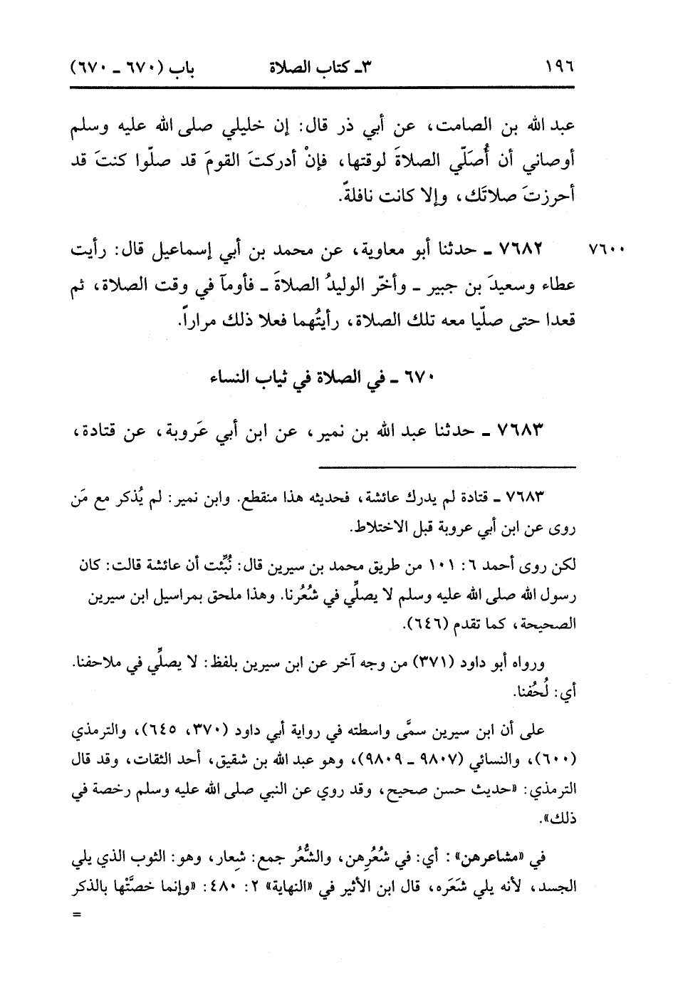 7683- حَدَّثَنَا عَبْدُ اللهِ بْنُ نُمَيْرٍ ، عَنِ ابْنِ أَبِي عَرُوبَةَ ، عَنْ قَتَادَةَ ، عَنْ عَائِشَةَ ، أَنَّ نَبِيَّ اللهِ صَلَّى الله عَلَيْهِ وَسَلَّمَ كَانَ يَكْرَهُ الصَّلاَة فِي مَشَاعِرِهِنَّ. (2/382).