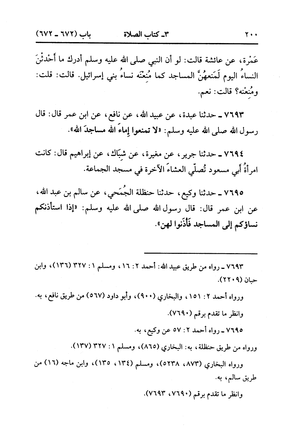 7695- حَدَّثَنَا وَكِيعٌ ، حَدَّثَنَا حَنْظَلَةُ الْجُمَحِيُّ ، عَنْ سَالِمٍ بنِ عَبْدِ اللهِ ، عَنِ ابْنِ عُمَرَ ، قَالَ : قَالَ رَسُولُ اللهِ صَلَّى الله عَلَيْهِ وَسَلَّمَ : إذَا اسْتَأْذَنَكُمْ نِسَاؤُكُمْ إلَى الْمَسَاجِدِ فَأْذَنُوا لَهُنَّ. (2/383).