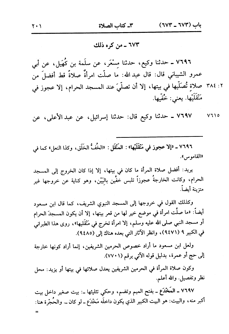 7696- حَدَّثَنَا وَكِيعٌ ، حَدَّثَنَا مِسْعَرٌ ، عَنْ سَلَمَةَ بْنِ كُهَيْلٍ ، عَنْ أَبِي عَمْرٍو الشَّيْبَانِيِّ ، قَالَ : قَالَ عَبْدُ اللهِ : مَا صَلَّتِ امْرَأَةٌ صَلاَةً قَطُّ أَفْضَلَ مِنْ صَلاَةٍ تُصَلِّيهَا فِي بَيْتِهَا إِلاَّ أَنْ تُصَلِّيَ عِنْدَ الْمَسْجِدِ الْحَرَامِ ، إِلاَّ عَجُوزٌ فِي مَنْقَلَيْهَا ، يَعْنِي خُفَّيْهَا. (2/383)