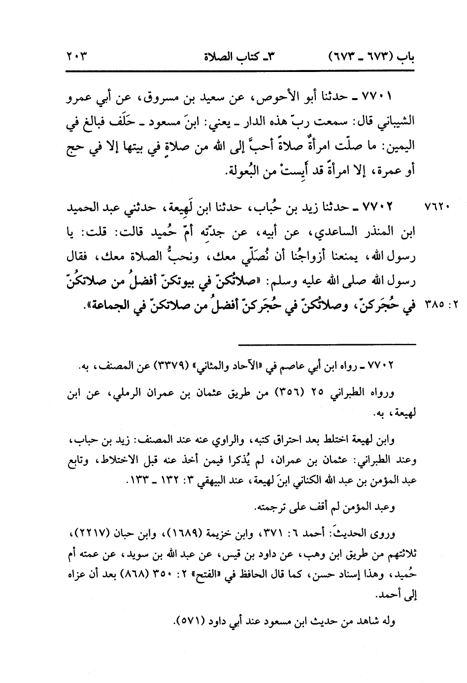7702- حَدَّثَنَا زَيْدُ بْنُ حُبَابٍ ، حَدَّثَنَا ابْنُ لَهِيعَةَ ، حَدَّثَنِي عَبْدُ الْحَمِيدِ بْنُ الْمُنْذِرِ السَّاعِدِيُّ ، عَنْ أَبِيهِ ، عَنْ جَدَّتِهِ أُمِّ حُمَيْدٍ ، قَالَتْ : قُلْتُ : يَا رَسُولَ اللهِ يَمْنَعُنَا أَزْوَاجُنَا أَنْ نُصَلِّيَ مَعَكَ وَنُحِبُّ الصَّلاَة مَعَكَ ، فَقَالَ رَسُولُ اللهِ صَلَّى الله عَلَيْهِ وَسَلَّمَ : صَلاَتُكُنَّ فِي بُيُوتِكُنَّ أَفْضَلُ مِنْ صَلاَتِكُنَّ فِي حُجَرِكُنَّ ، وَصَلاَتُكُنَّ فِي حُجَرِكُنَّ أَفْضَلُ مِنْ صَلاَتِكُنَّ فِي الْجَمَاعَةِ. (2/384).