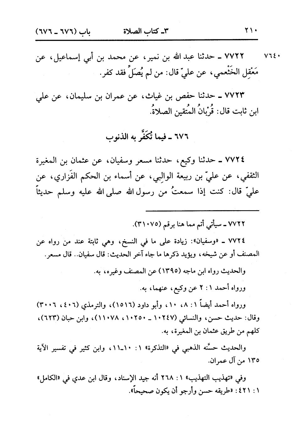 7724- حَدَّثَنَا وَكِيعٌ ، حَدَّثَنَا مِسْعَرٌ وَسُفْيَان ، عَنْ عُثْمَانَ بْنِ الْمُغِيرَةِ الثَّقَفِيِّ ، عَنْ عَلِيِّ بْنِ رَبِيعَةَ الْوَالِبِيِّ ، عَنْ أَسْمَاءَ بْنِ الْحَكَمِ الْفَزَارِيِّ ، عَنْ عَلِيٍّ قَالَ : كُنْتُُ إذَا سَمِعْتُ مِنْ رَسُولِ اللهِ صَلَّى الله عَلَيْهِ وَسَلَّمَ حَدِيثًا نَفَعَنِي اللَّهُ بِمَا شَاءَ مِنْهُ فَإِذَا حَدَّثَنِي عَنْهُ غَيْرِي اسْتَحْلَفْتُهُ فَإِذَا حَلَفَ لِي صَدَّقْتُهُ ، وَإِنَّ أَبَا بَكْرٍ حَدَّثَنِي وَصَدَقَ أَبُو بَكْرٍ ، أَنَّهُ صَلَّى الله عَلَيْهِ وَسَلَّمَ قَالَ : مَا مِنْ رَجُلٍ يُذْنِبُ ذَنْبًا فَيَتَوَضَّأُ فَيُحْسِنُ الْوُضُوءَ ، قَالَ سُفْيَانُ : ثُمَّ يُصَلِّي رَكْعَتَيْنِ ، قَالَ مِسْعَرٌ : ثُمَّ يُصَلِّي فَيَسْتَغْفِرُ اللَّهَ إِلاَّ غَفَرَ لَهُ. (2/387).