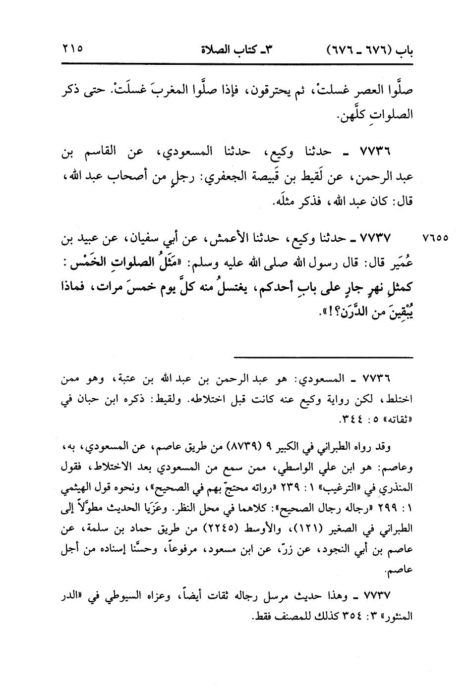 7737- حَدَّثَنَا وَكِيعٌ ، حَدَّثَنَا الأَعْمَش ، عَنْ أَبِي سُفْيَانَ ، عَنْ عُبَيْدِ بْنِ عُمَيْرٍ ، قَالَ : قَالَ رَسُولُ اللهِ صَلَّى الله عَلَيْهِ وَسَلَّمَ : مَثَلُ الصَّلَوَاتِ الْخَمْسِ كَمَثَلِ نَهْرٍ جَارٍ عَلَى بَابِ أَحَدِكُمْ يَغْتَسِلُ مِنْهُ كُلَّ يَوْمٍ خَمْسَ مَرَّاتٍ ، فَمَاذَا يُبْقِينَ مِنَ الدَّرَنِ؟. (2/389).