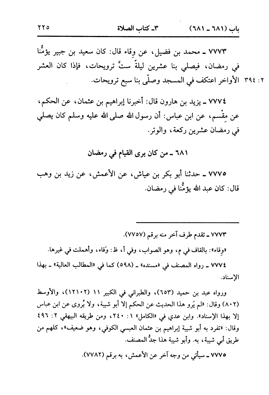 7773- حَدَّثَنَا مُحَمَّدُ بْنُ فُضَيْلٍ ، عَنْ وِقَاءٍ ، قَالَ : كَانَ سَعِيدُ بْنُ جُبَيْرٍ يَؤُمُّنَا فِي رَمَضَانَ فَيُصَلِّي بِنَا عِشْرِينَ لَيْلَةً سِتَّ تَرْوِيحَاتٍ ، فَإِذَا كَانَ الْعَشْرُ الآخَرُ اعْتَكَفَ فِي الْمَسْجِدِ وَصَلَّى بِنَا سَبْعَ تَرْوِيحَاتٍ. (2/393)