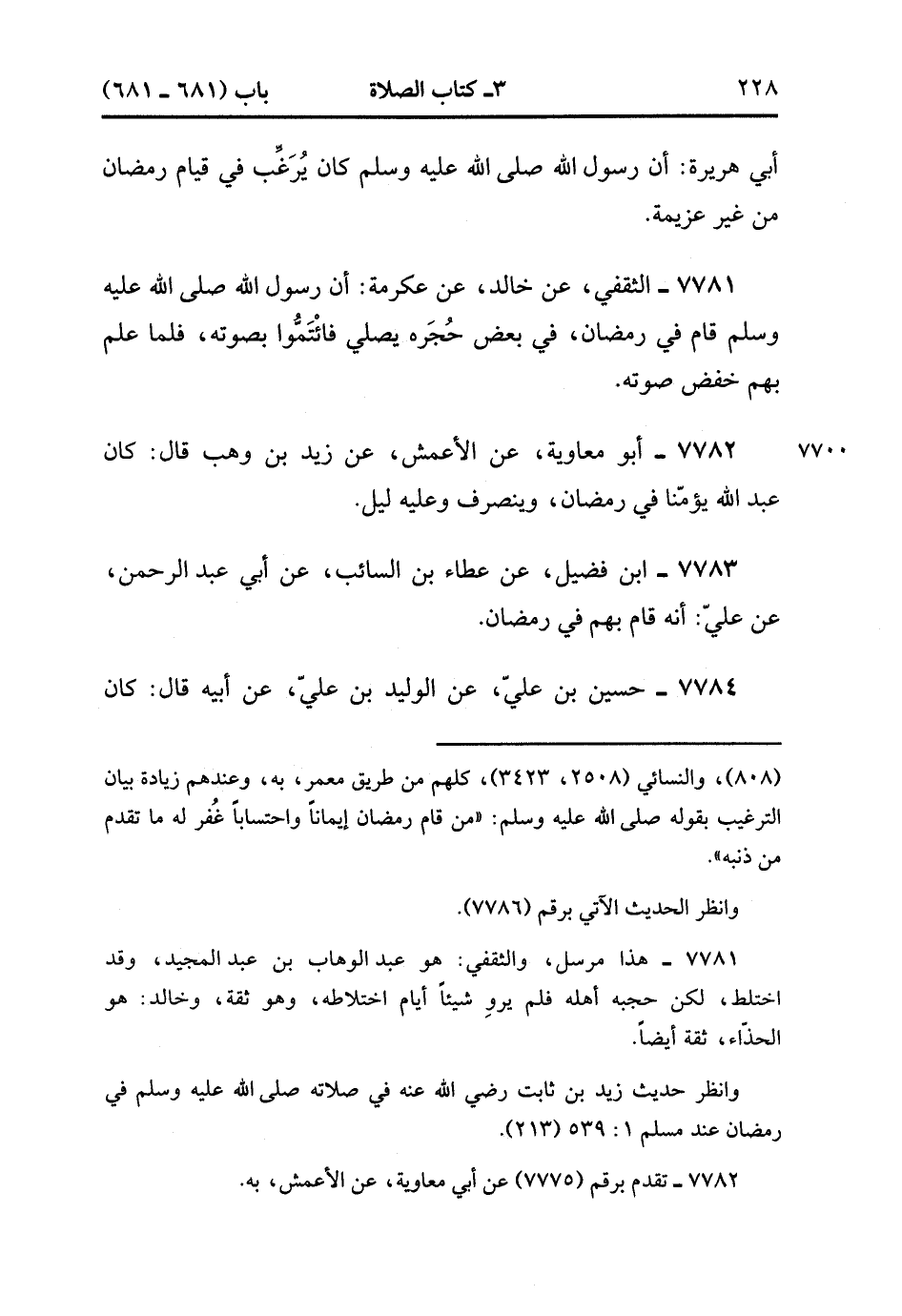 7783- حَدَّثَنَا ابْنُ فُضَيْلٍ ، عَنْ عَطَاءِ بْنِ السَّائِبِ ، عَنْ أَبِي عَبْدِ الرَّحْمَنِ ، عَنْ عَلِيٍّ : أَنَّهُ قَامَ بِهِمْ فِي رَمَضَانَ.