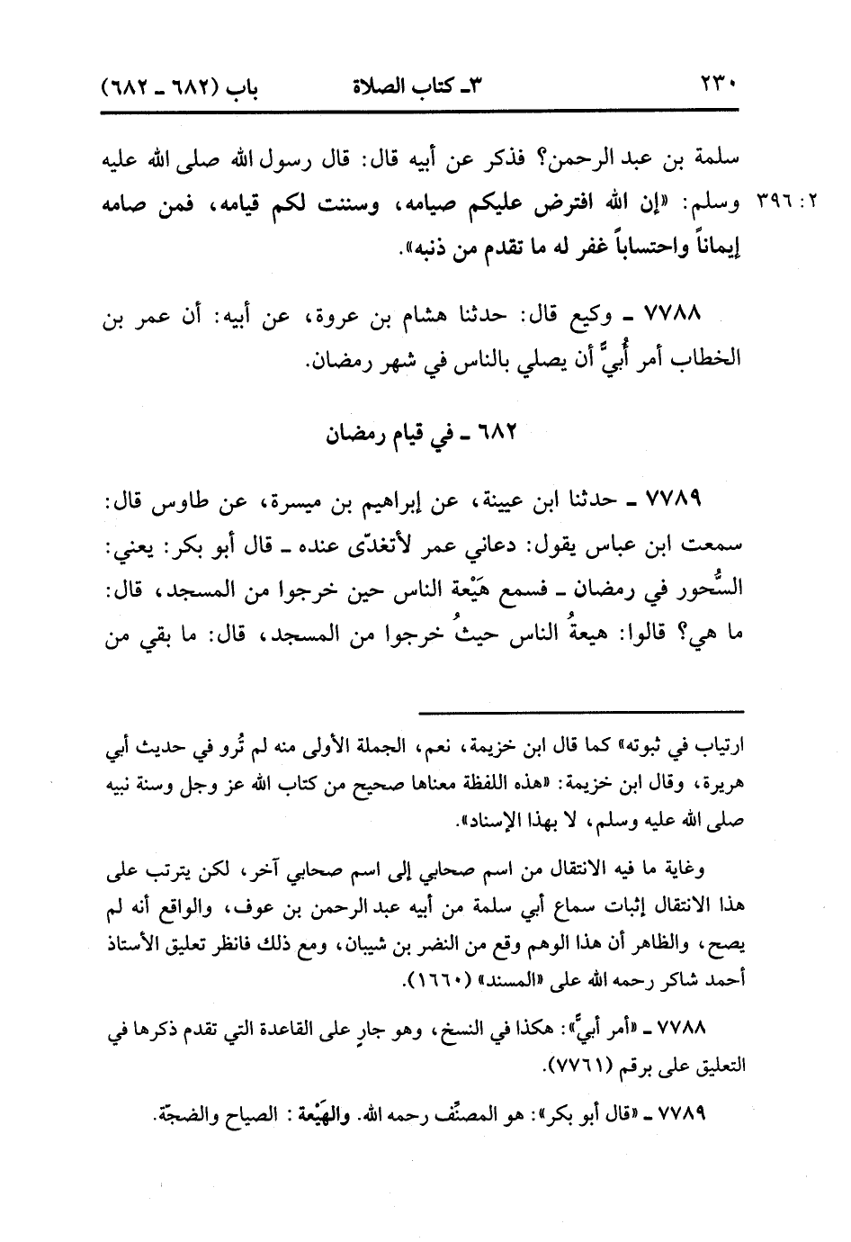 7788- حَدَّثَنَا وَكِيعٌ , قَالَ : حدَّثَنَا هِشَامُ بْنُ عُرْوَةَ ، عَنْ أَبِيهِ ؛ أَنَّ عُمَرَ بْنَ الْخَطَّابِ أَمَرَ أُبَيًّا أَنْ يُصَلِّيَ بِالنَّاسِ فِي شَهْرِ رَمَضَانَ.