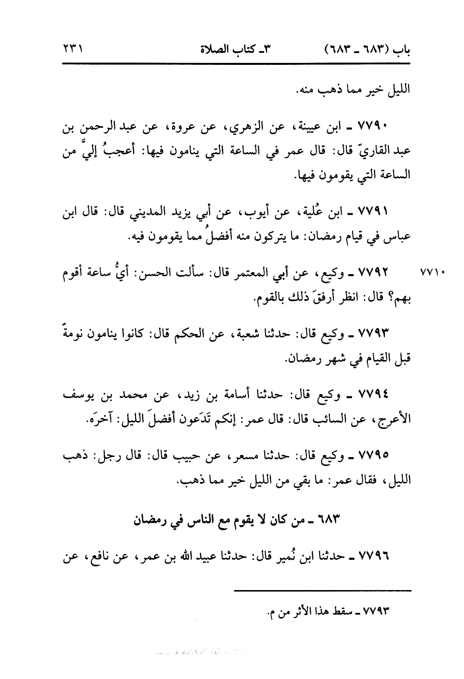 7796- حَدَّثَنَا ابْنُ نُمَيْرٍ , قَالَ : حدَّثَنَا عُبَيْدُ اللهِ بْنُ عُمَرَ ، عَنْ نَافِعٍ ، عَنِ ابْنِ عُمَرَ ، أَنَّهُ كَانَ لاَ يَقُومُ مَعَ النَّاسِ فِي شَهْرِ رَمَضَانَ ، قَالَ : وَكَانَ سَالِمٌ وَالْقَاسِمُ لاَ يَقُومُانَ مَعَ النَّاسِ. (2/396).