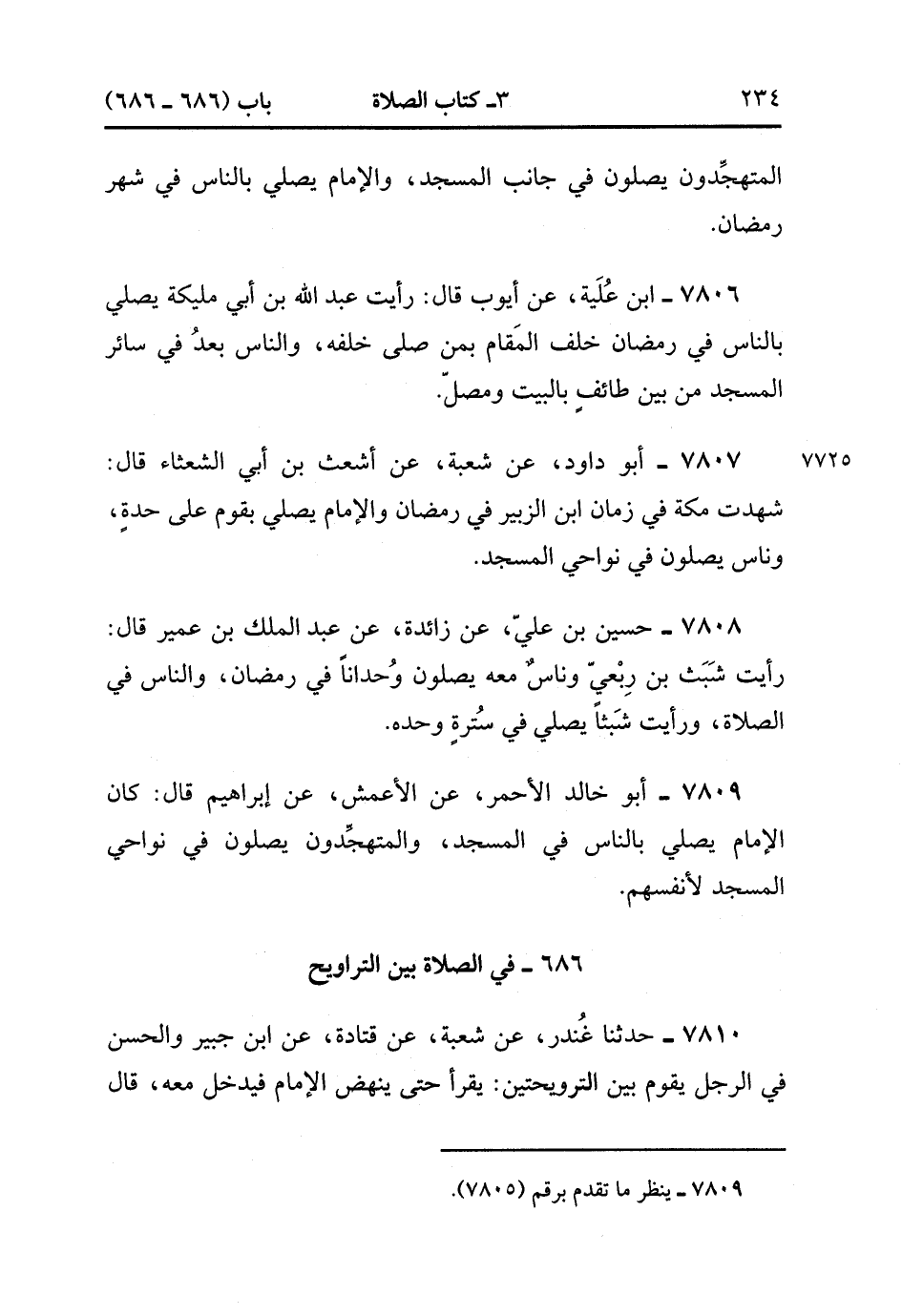 7806- حَدَّثَنَا ابْنُ عُلَيَّةَ ، عَنْ أَيُّوبَ ، قَالَ : رَأَيْتُُ عَبْدَ اللهِ بْنَ أَبِي مُلَيْكَةَ يُصَلِّي بِالنَّاسِ فِي رَمَضَانَ خَلْفَ الْمَقَامِ بِمَنْ صَلَّى خَلْفَهُ وَالنَّاسُ بَعْدُ فِي سَائِرِ الْمَسْجِدِ مِنْ بَيْنِ طَائِفٍ بِالْبَيْتِ وَمُصَلٍّ.