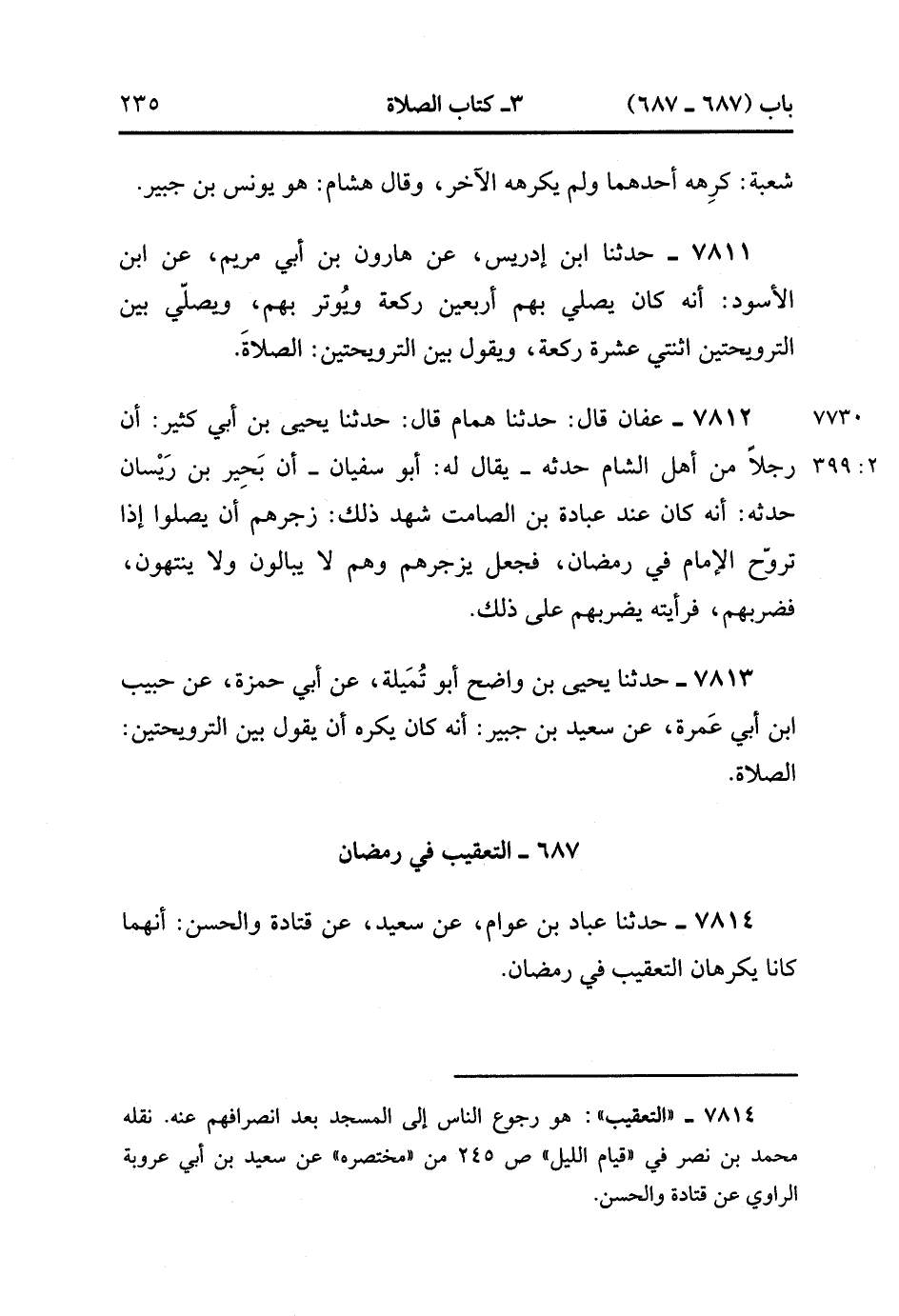 7814- حَدَّثَنَا عَبَّادُ بْنُ عَوَّامٍ ، عَنْ سَعِيدٍ ، عَنْ قَتَادَةَ والحسن : أَنَّهُمَا كَانَا يَكْرَهَانِ التَّعْقِيبَ فِي رَمَضَانَ. (2/399).
