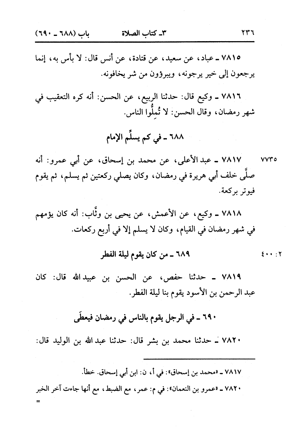 7819- حَدَّثَنَا حَفْصٌ ، عَنِ الْحَسَنِ بْنِ عُبَيْدِ اللهِ ، قَالَ : كَانَ عَبْدُ الرَّحْمَنِ بْنُ الأَسْوَدِ يَقُومُ بِنَا لَيْلَةَ الْفِطْرِ. (2/400).