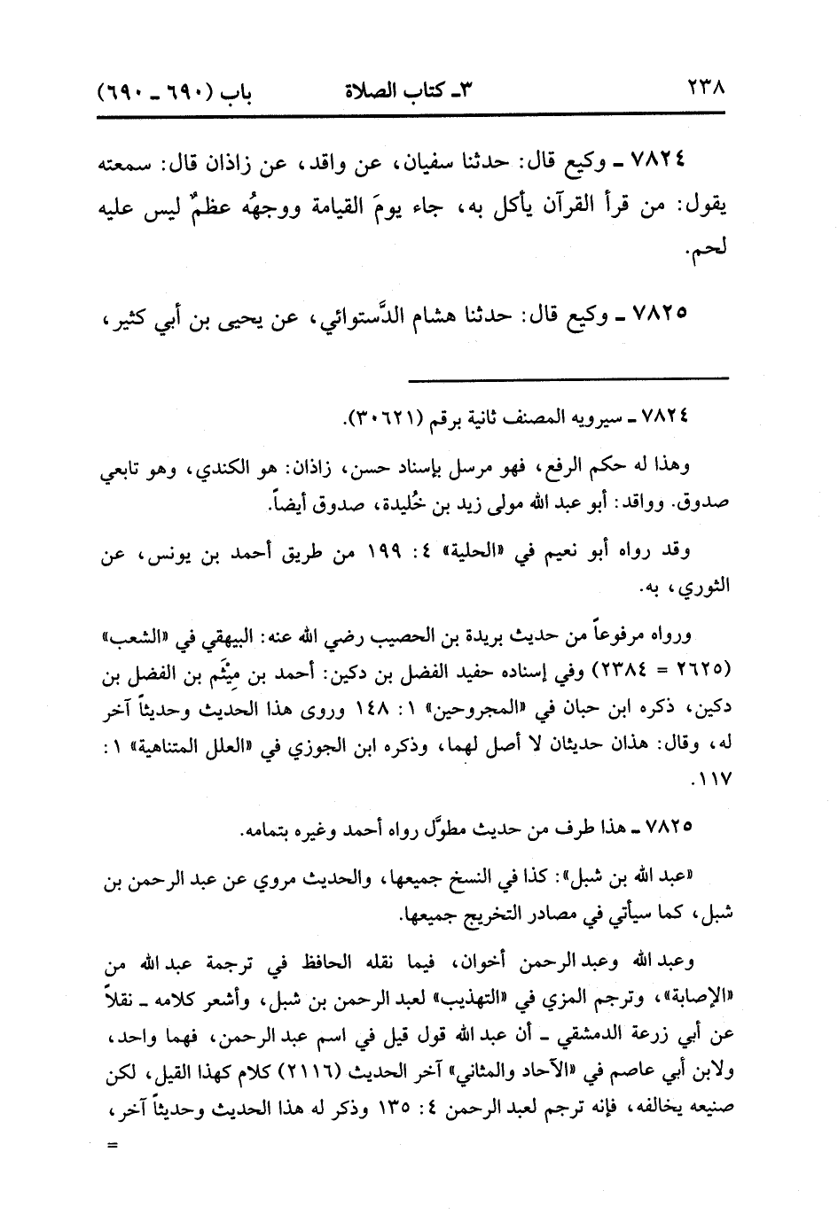 7824- حَدَّثَنَا وَكِيعٌ , قَالَ : حدَّثَنَا سُفْيَانُ ، عَنْ وَاقِدٍ ، عَنْ زَاذَانَ ، قَالَ سَمِعْتُهُ يَقُولُ : مَنْ قَرَأَ الْقُرْآنَ يَأْكُلُ بِهِ جَاءَ يَوْمَ الْقِيَامَةِ وَوَجْهُهُ عَظْمٌ لَيْسَ عَلَيْهِ لَحْمٌ. (2/400).