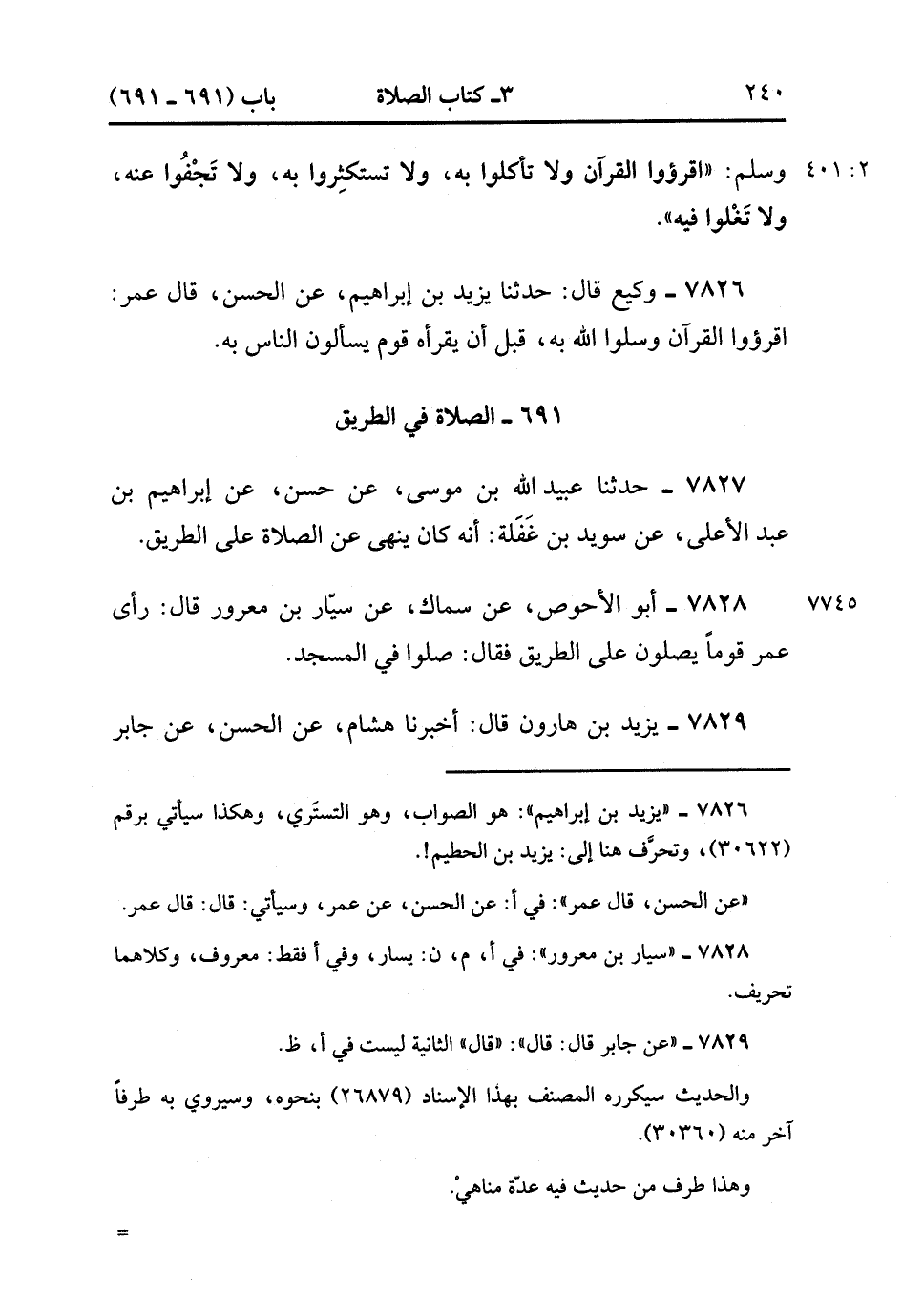 7828- حَدَّثَنَا أَبُو الأَحْوَصِ ، عَنْ سِمَاكٍ ، عَنْ سَيَّارِ بْنِ مَعْرُورٍ قَالَ : رَأَى عُمَرُ قَوْمًا يُصَلُّونَ عَلَى الطَّرِيقِ ، فَقَالَ : صَلُّوا فِي الْمَسْجِدِ. (2/401).