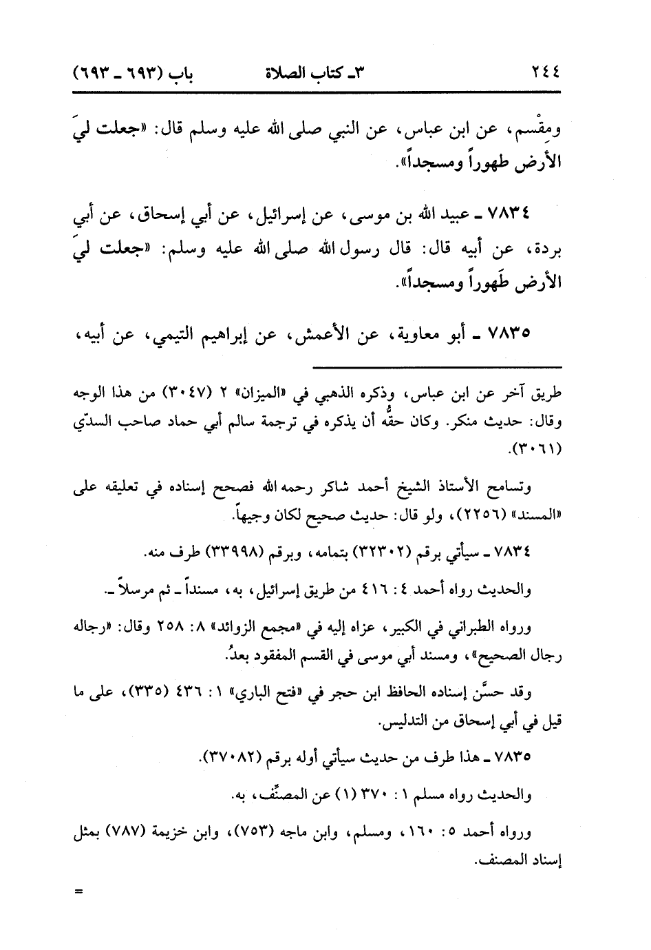 7834- حَدَّثَنَا عُبَيْدُ اللهِ بْنُ مُوسَى ، عَنْ إسْرَائِيلَ ، عَنْ أَبِي إِسْحَاقَ ، عَنْ أَبِي بُرْدَةَ ، عَنْ أَبِيهِ ، قَالَ : قَالَ رَسُولُ اللهِ صَلَّى الله عَلَيْهِ وَسَلَّمَ : جُعِلَتْ لِي الأَرْضُ طَهُورًا وَمَسْجِدًا.