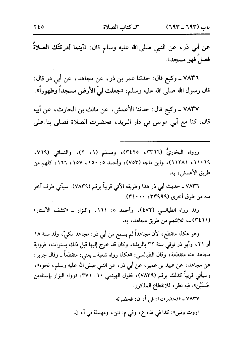 7836- حَدَّثَنَا وَكِيعٌ , قَالَ : حدَّثَنَا عُمَر بْن ذَرٍّ ، عَنْ مُجَاهِدٍ ، عَنْ أَبِي ذَرٍّ قَالَ : قَالَ رَسُولُ اللهِ صَلَّى الله عَلَيْهِ وَسَلَّمَ : جُعِلَتْ لِي الأَرْضُ مَسْجِدًا وَطَهُورًا.