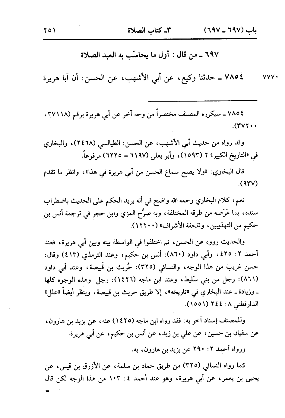 7854- حَدَّثَنَا وَكِيعٌ ، عَنْ أَبِي الأَشْهَبِ ، عَنِ الْحَسَنِ ؛ أَنَّ أَبَا هُرَيْرَةَ لَقِيَ رَجُلاً ، فَقَالَ : كَأَنَّك لَسْتَ مِنْ أَهْلِ الْبَلَدِ ؟ قَالَ : أَجَلْ ، قَالَ : أَلاَ أُحَدِّثُكَ حَدِيثًا سَمِعْتُهُ مِنْ رَسُولِ اللهِ صَلَّى الله عَلَيْهِ وَسَلَّمَ لَعَلَّك أَنْ تنْتَفِعَ بِهِ ؟ سَمِعْتُ رَسُولَ اللهِ صَلَّى الله عَلَيْهِ وَسَلَّمَ يَقُولُ : أَوَّلُ مَا يُحَاسَبُ بِهِ الْعَبْدُ الصَّلاَة ، فَإِنْ كَانَ أَتَمَّهَا وَالأَ قِيلَ لِلْمَلاَئِكَةِ أَكْمِلُوا صَلاَتَهُ مِنْ تَطَوُّعِهِ ، قَالَ الْحَسَنُ : وَسَائِرُ الأَعْمَالِ عَلَى ذَلِكَ. (2/404).