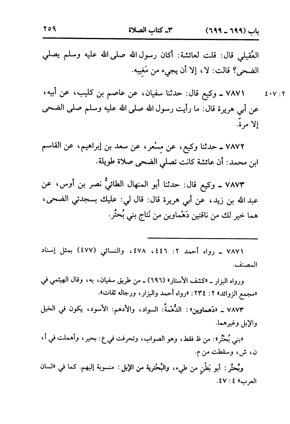7873- حَدَّثَنَا وَكِيعٌ , قَالَ : حدَّثَنَا أَبُو الْمِنْهَالِ الطَّائِيُّ نَصْرُ بْنُ أَوْسٍ ، عَنْ عَبْدِ اللهِ بْنِ زَيْدٍ ، عَنْ أَبِي هُرَيْرَةَ ، قَالَ : قَالَ لِي : عَلَيْك بِسَجْدَتَيَ الضُّحَى هُمَا خَيْرٌ لَكَ مِنْ نَاقَتَيْنِ دَهْمَاوَيْنِ مِنْ نَتَاجِ بَنِي بُحتُر. (2/407).