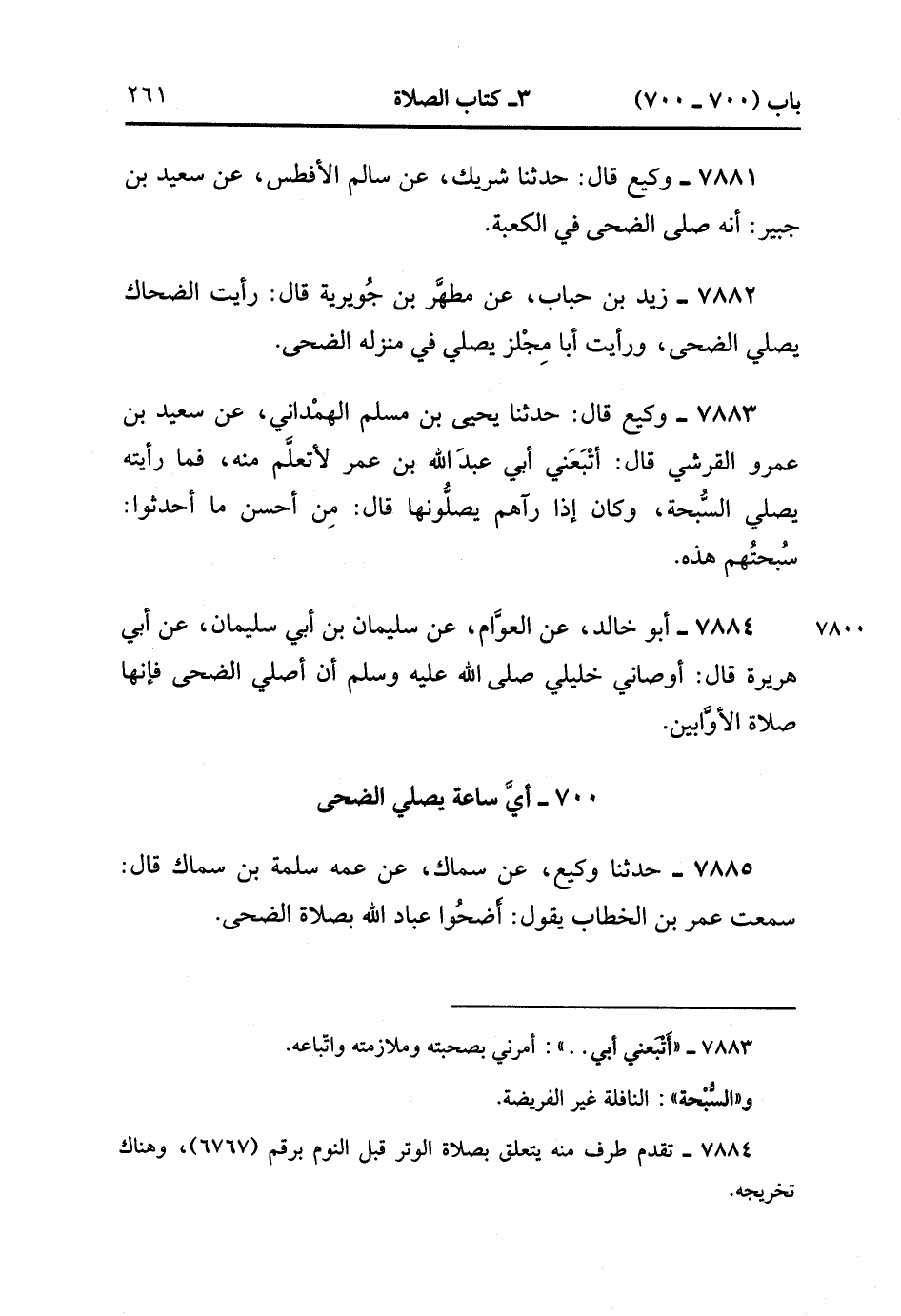 7885- حَدَّثَنَا وَكِيعٌ ، عَنْ سِمَاكٍ ، عَنْ عَمِّهِ سَلَمَةَ بْنِ سِمَاكٍ ، قَالَ : سَمِعْتُ عُمَرَ بْنَ الْخَطَّابِ يَقُولُ : أَضْحُوا عِبَادَ اللهِ بِصَلاَةِ الضُّحَى. (2/408).