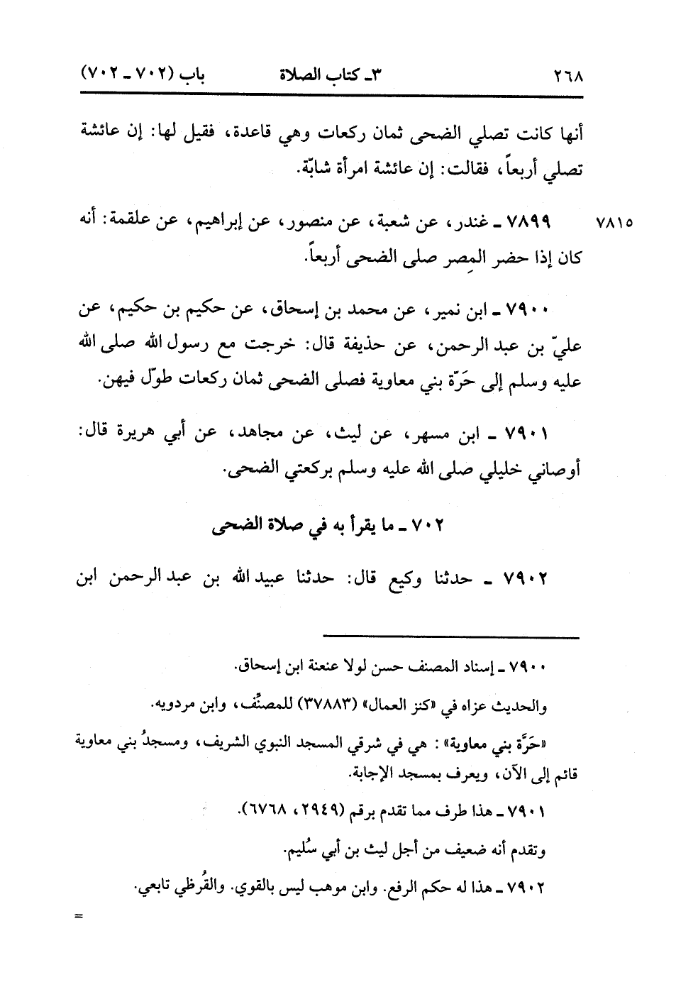 7900- حَدَّثَنَا ابْنُ نُمَيْرٍ ، عَنْ مُحَمَّدِ بْنِ إِسْحَاقَ ، عَنْ حَكِيمِ بْنِ حَكِيمٍ ، عَنْ عَلِيِّ بْنِ عَبْدِ الرَّحْمَنِ ، عنْ حُذَيْفَةَ ، قَالَ : خَرَجْتُ مَعَ رَسُولِ اللهِ صَلَّى الله عَلَيْهِ وَسَلَّمَ إلَى حَرَّةِ بَنِي مُعَاوِيَةَ فَصَلَّى الضُّحَى ثَمَانِ رَكَعَاتٍ طَوَّلَ فِيهِنَّ.