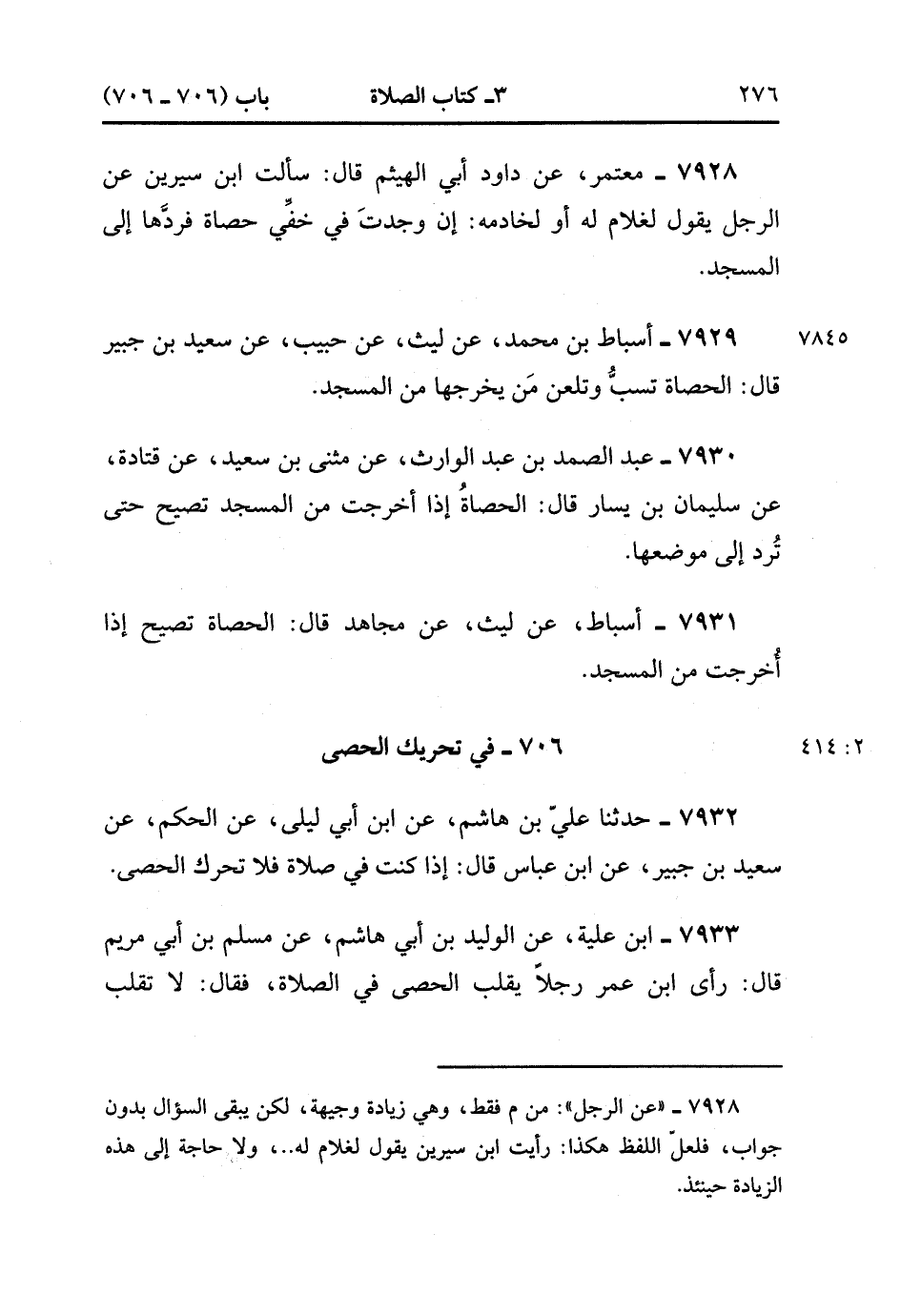 7933- حَدَّثَنَا ابْنُ عُلَيَّةَ ، عَنِ الْوَلِيدِ بْنِ أَبِي هَاشِمٍ ، عَنْ مُسْلِمِ بْنِ أَبِي مَرْيَمَ ، قَالَ : رَأَى ابْنُ عُمَرَ رَجُلاً يُقَلِّبُ الْحَصَى فِي الصَّلاَة ، فَقَالَ : لاَ تُقَلِّبَ الْحَصَاةَ فِي الصَّلاَة ، فَإِنَّهُ مِنَ الشَّيْطَانِ. (2/414).