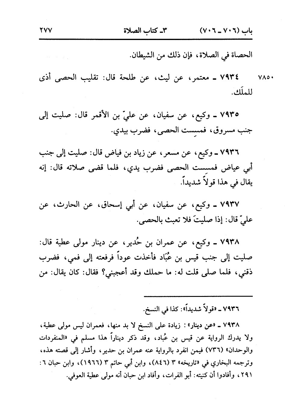 7938- حَدَّثَنَا وَكِيعٌ ، عَنْ عِمْرَانَ بْنَ حُدَيْرٍ ، عَنْ دينَارمَوْلَى عَطِيَّةَ ، قَالَ : صَلَّيْتُ إلَى جَنْبِ قَيْسِ بْنِ عُبَادٍ فَأَخَذْت عُودًا فَرَفَعْتُهُ إلَى فَمي فَضَرَبَ ذَقَنِي ، فَلَمَّا صَلَّى قُلْتُ لَهُ مَا حَمَلَك ؟ وَقَدْ أَعْجَبَنِي ، فَقَالَ : كَانَ يُقَالَ : مَنْ عَبِثَ بِشَيْءٍ فِي صَلاَتِهِ كَانَ حَظَّهُ مِنْ صَلاَتِهِ. (2/414).