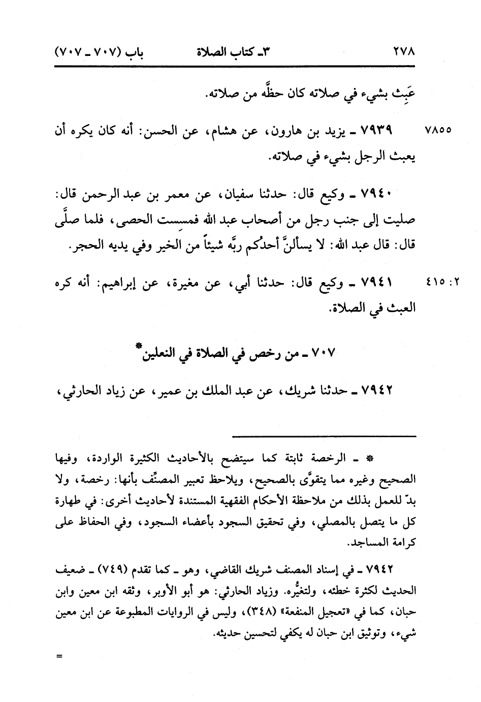 7941- حَدَّثَنَا وَكِيعٌ , قَالَ : حدَّثَنَا أَبِي ، عَنْ مُغِيرَةَ ، عَنْ إبْرَاهِيمَ : أَنَّهُ كَرِهَ الْعَبَثَ فِي الصَّلاَةِ. (2/415).