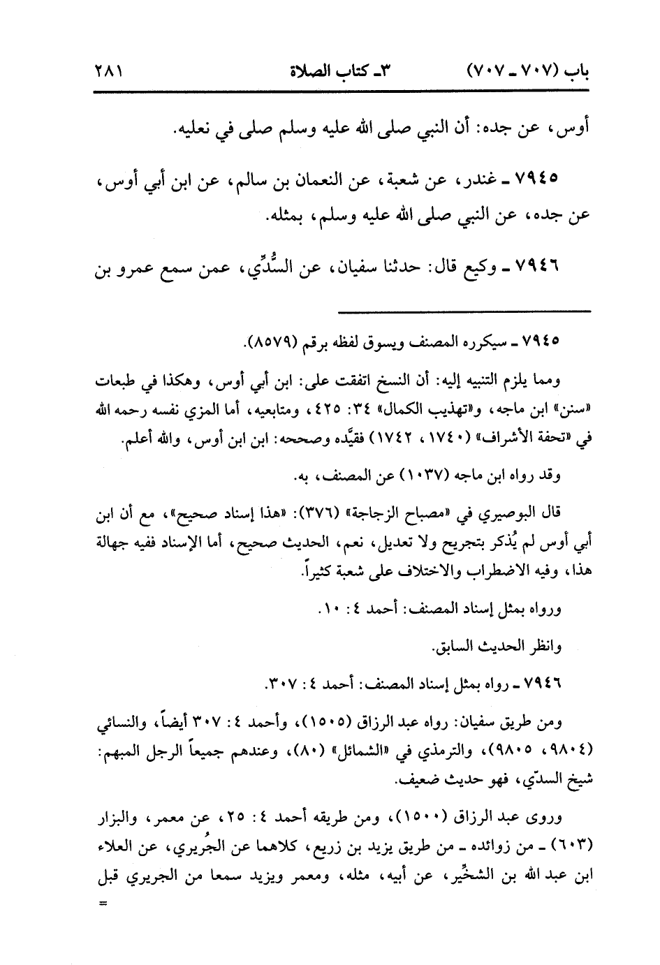 7946- حَدَّثَنَا وَكِيعٌ , قَالَ : حدَّثَنَا سُفْيَانُ ، عَنِ السُّدِيِّ عَمَّنْ سَمِعَ عَمْرَو بْنَ حُرَيْثٍ ؛ أَنَّ النَّبِيَّ صَلَّى الله عَلَيْهِ وَسَلَّمَ صَلَّى فِي نَعْلَيْهِ. (2/415).