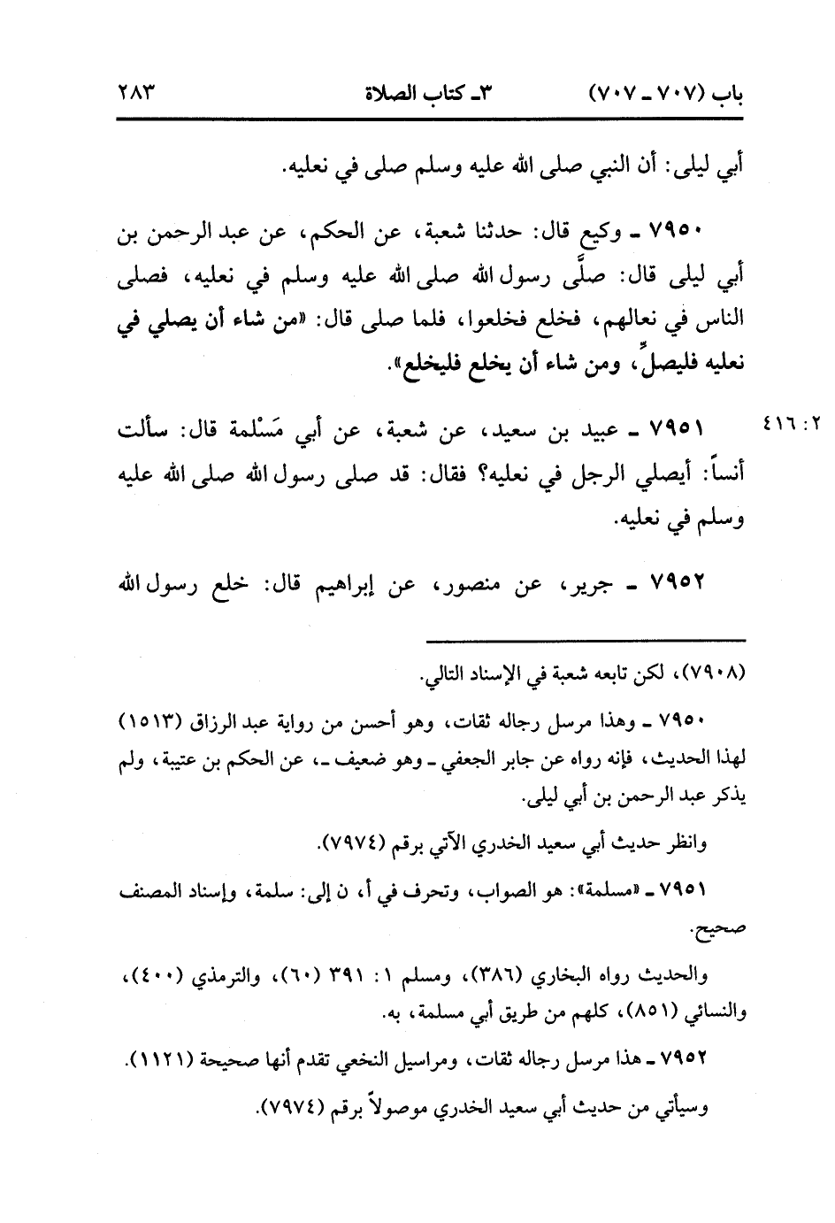 7952- حَدَّثَنَا جَرِيرٌ ، عَنْ مَنْصُورٍ ، عَنْ إبْرَاهِيمَ ، قَالَ : خَلَعَ رَسُولُ اللهِ صَلَّى الله عَلَيْهِ وَسَلَّمَ نَعْلَيْهِ وَهُوَ فِي الصَّلاَة ، فَخَلَعَ النَّاسُ نِعَالَهُمْ ، ثُمَّ لَبِسَهُمَا فَلَمْ يُرَ نَازِعَهُمَا بَعْدُ. (2/416).