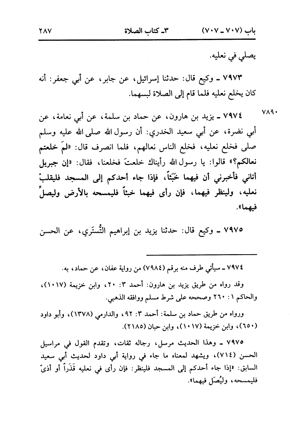 7974- حَدَّثَنَا يَزِيدُ بْنُ هَارُونَ ، عَنْ حَمَّادِ بْنِ سَلَمَةَ ، عَنْ أَبِي نَعَامَةَ ، عَنْ أَبِي نَضْرَةَ ، عَنْ أَبِي سَعِيدٍ الْخُدْرِيِّ ؛ أَنَّ رَسُولَ اللهِ صَلَّى الله عَلَيْهِ وَسَلَّمَ صَلَّى فَخَلَعَ نَعْلَيْهِ فَخَلَعَ النَّاسُ نِعَالَهُمْ ، فَلَمَّا انْصَرَفَ قَالَ : لِمَ خَلَعْتُمْ نِعَالَكُمْ ؟ قَالُوا : يَا رَسُولَ اللهِ رَأَيْنَاك خَلَعْتَ فَخَلَعْنَا ، فَقَالَ : إنَّ جِبْرِِيلَ أَتَانِي فَأَخْبَرَنِي أَنَّ فِيهِمَا خَبَثًا فَإِذَا جَاءَ أَحَدُكُمْ إلَى الْمَسْجِدِ فَلْيَقْلِبْ نَعْلَيْهِ وَلْيَنْظُرْ فِيهِمَا فَإنْ رَأى فِيهِمَا خَبَثًا فَلْيَمْسَحْهُ بِالأَرْضِ وَلْيُصَلِّ فِيهِمَا. (2/417).