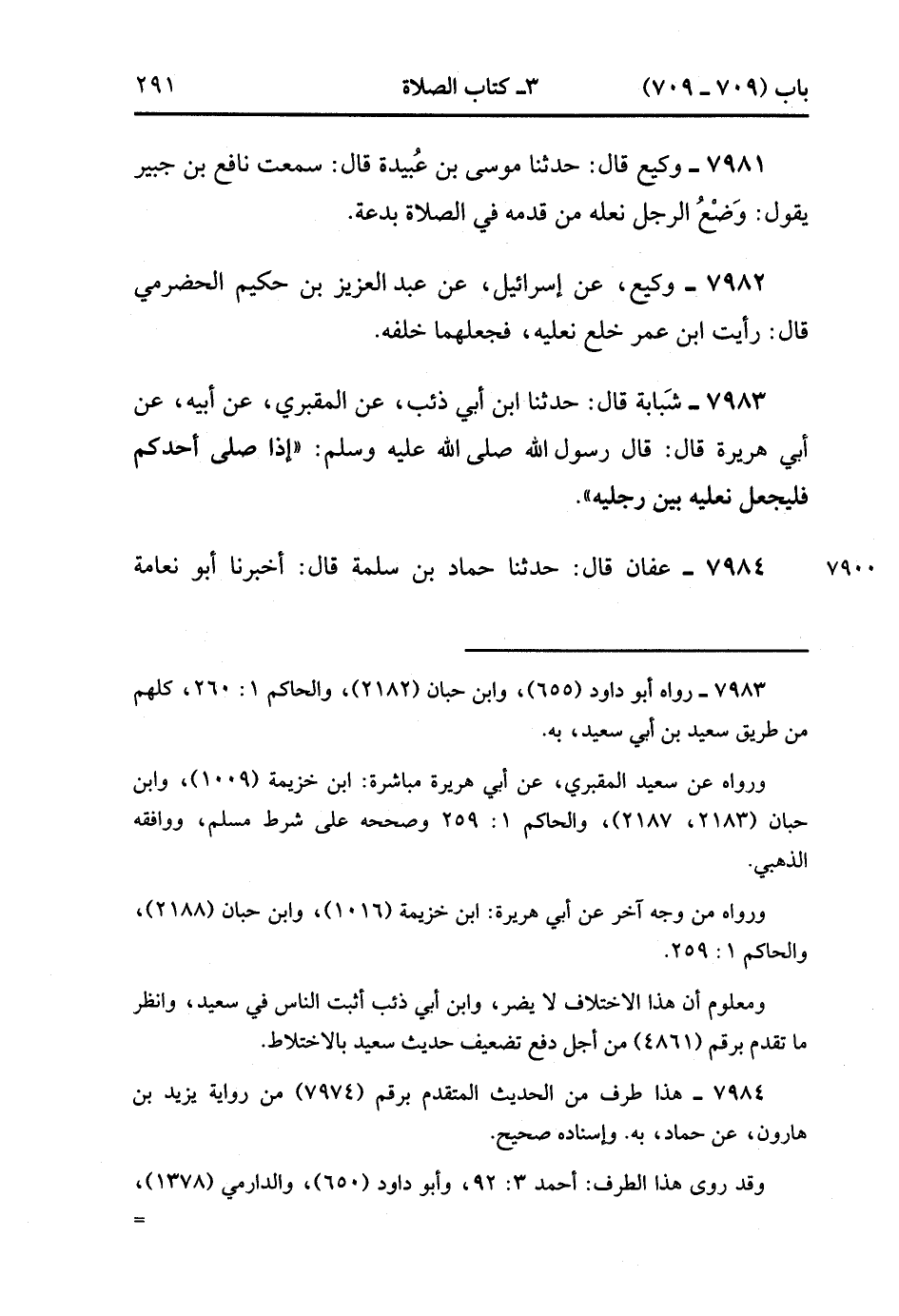 7981- حَدَّثَنَا وَكِيعٌ , قَالَ : حدَّثَنَا مُوسَى بْنُ عُبَيْدَةَ ، قَالَ : سَمِعْتُ نَافِعَ بْنَ جُبَيْرٍ يَقُولُ : وَضْعُ الرَّجُلِ نَعْلَهُ مِنْ قدمه ِفِي الصَّلاَة بِدْعَةٌ.