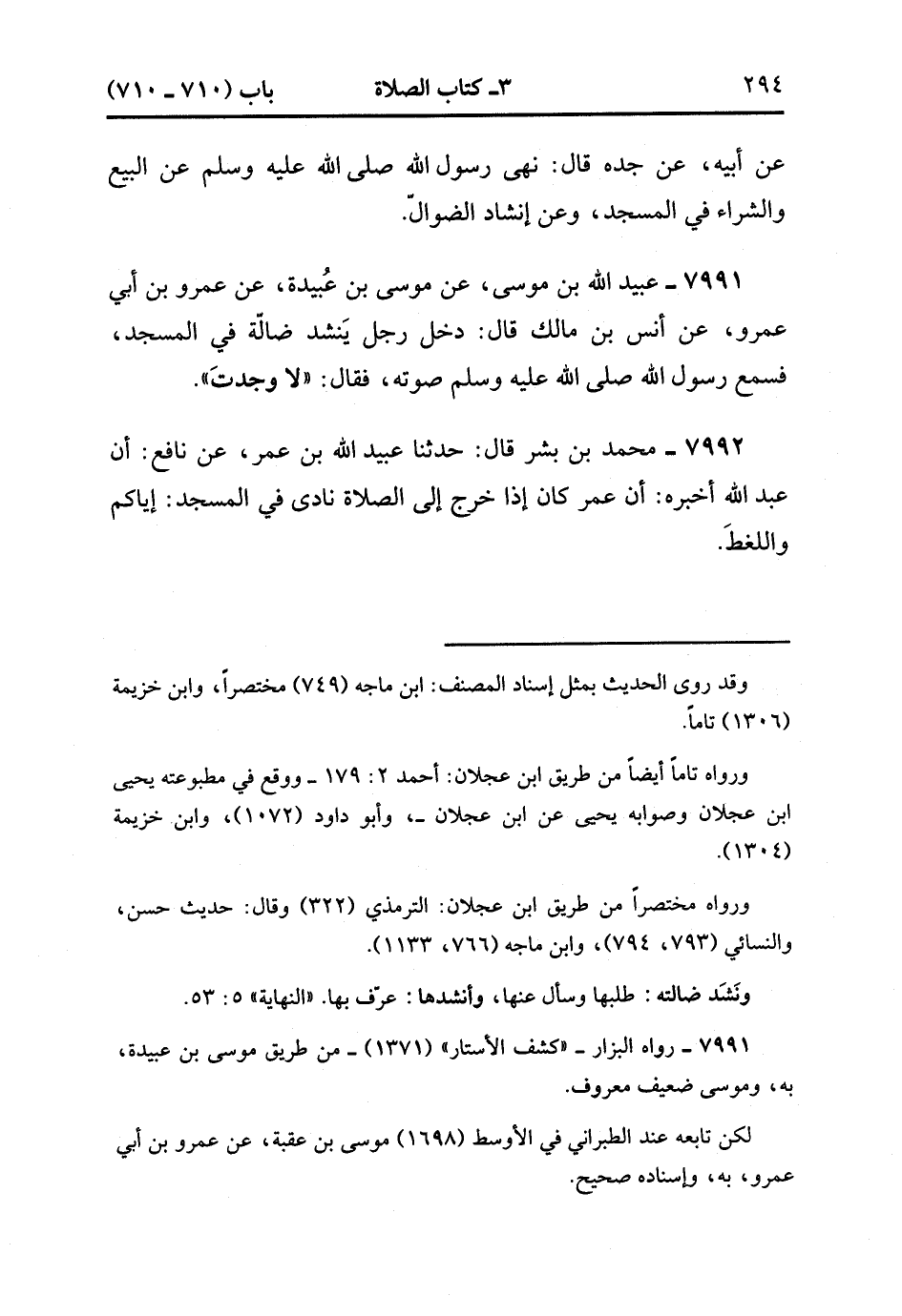 7992- حَدَّثَنَا مُحَمَّدُ بْنُ بِشْرٍ , قَالَ : حدَّثَنَا عُبَيْدُ اللهِ بْنُ عُمَرَ ، عَنْ نَافِعٍ ، أَنَّ عَبْدَ اللهِ أَخْبَرَهُ ؛ أَنَّ عُمَرَ كَانَ إذَا خَرَجَ إلَى الصَّلاَة نَادٍى فِي الْمَسْجِدِ ، قَالَ : إيَّاكُمْ وَاللَّغَطَ. (2/419).