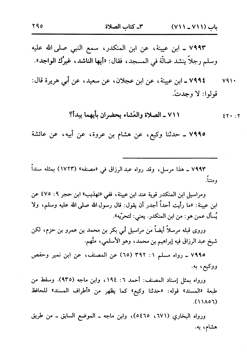 7995- حَدَّثَنَا وَكِيعٌ ، عَنْ هِشَامِ بْنِ عُرْوَةَ ، عَنْ أَبِيهِ ، عَنْ عَائِشَةَ ، قَالَتْ : قَالَ رَسُولُ اللهِ صَلَّى الله عَلَيْهِ وَسَلَّمَ : إذَا حَضَرَتِ الصَّلاَة وَوُضِعَ الْعَشَاءُ فَابْدَؤُوا بِالْعَشَاءِ. (2/420).